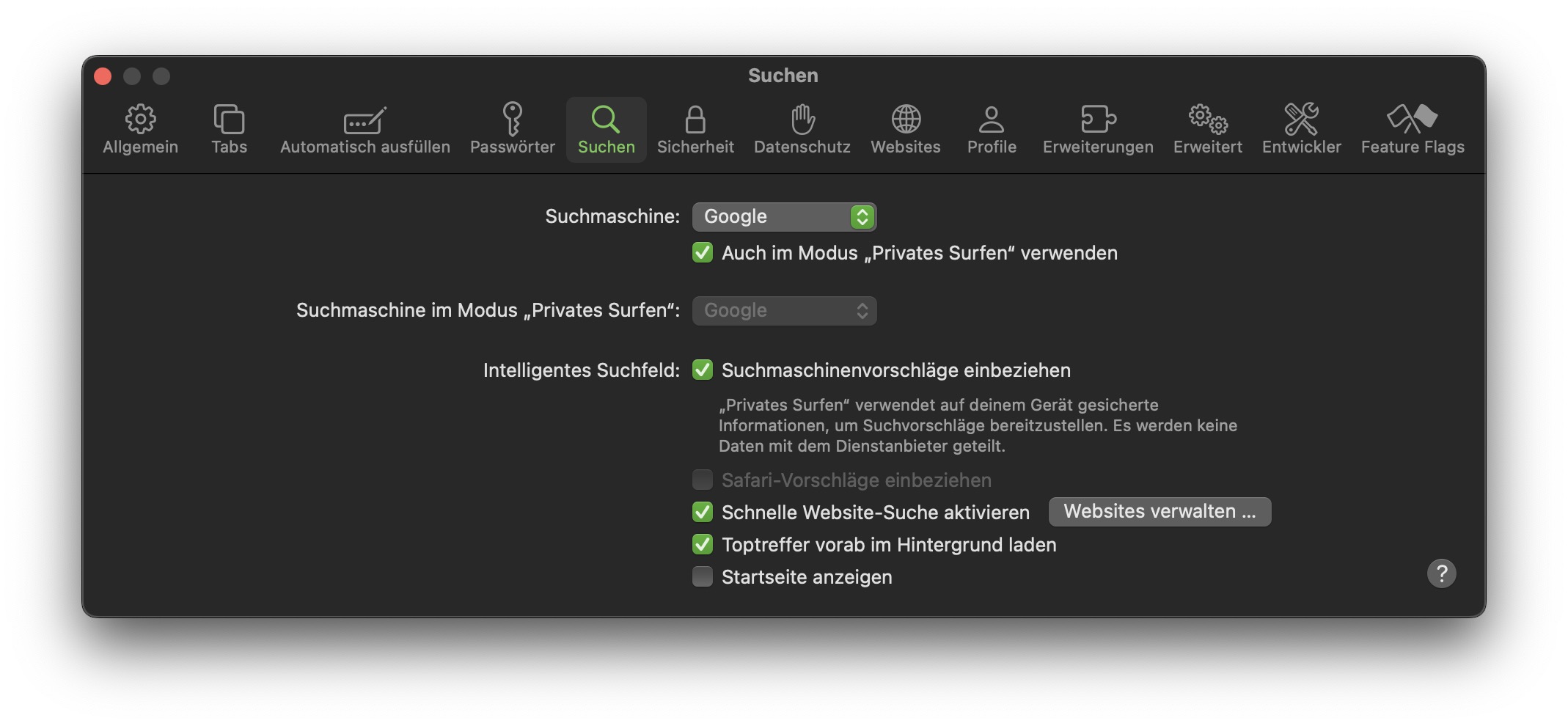 Dann in einem Akt der Verzweiflung in Sucheinstellungen den Haken bei "Startseite anzeigen" rausgekickt und siehe da 🍀 - Fall gelöst.