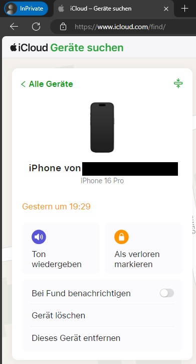 Das funktioniert aber nicht. Das offline iPhone wird auf der Website als solches (offline) angezeigt, ohne Standortdaten.
