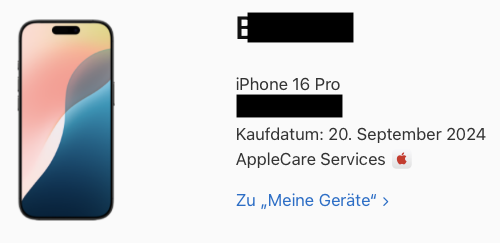 Ich habe beim Kauf meines iPhone 16 Pro bei Mediamarkt eine Geräteversicherung über SquareTrade abgeschlossen, diese beinhaltet AppleCare Services, folgendes wird mir auf der Apple Support Webseite beim Gerät angezeigt: