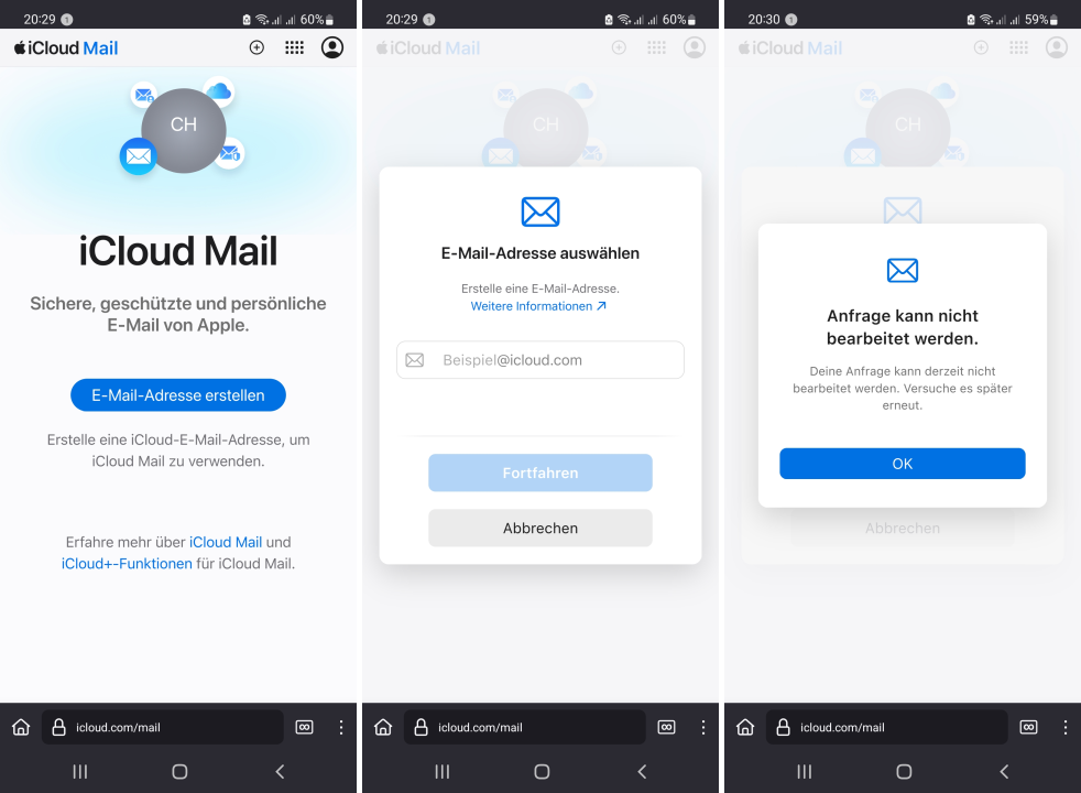 Wenn ich https://www.icloud.com/mail/ öffne und auf E-Mail-Adresse erstellen klicke und mir einen Alias ausdenke und versuche diesen einzugeben, kommt immer der Fehler: