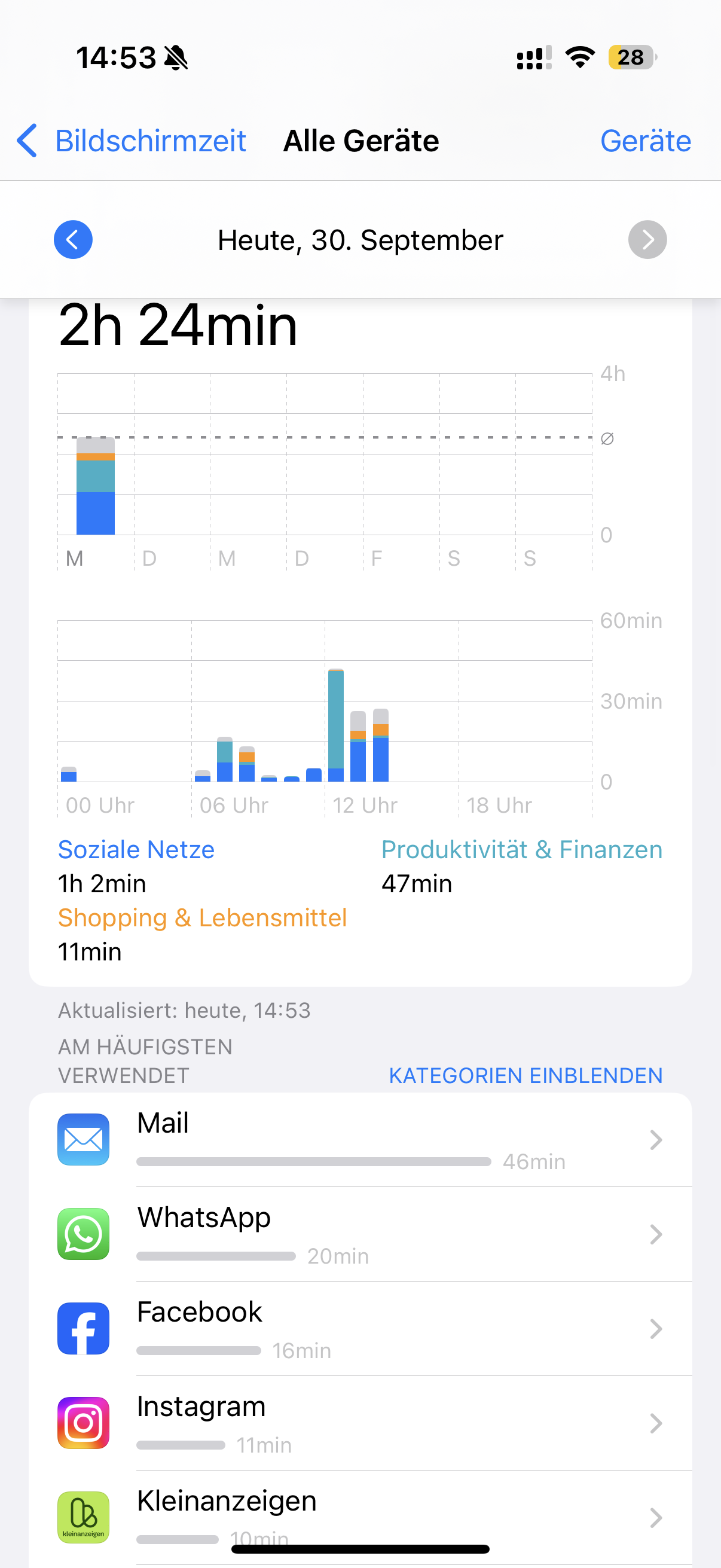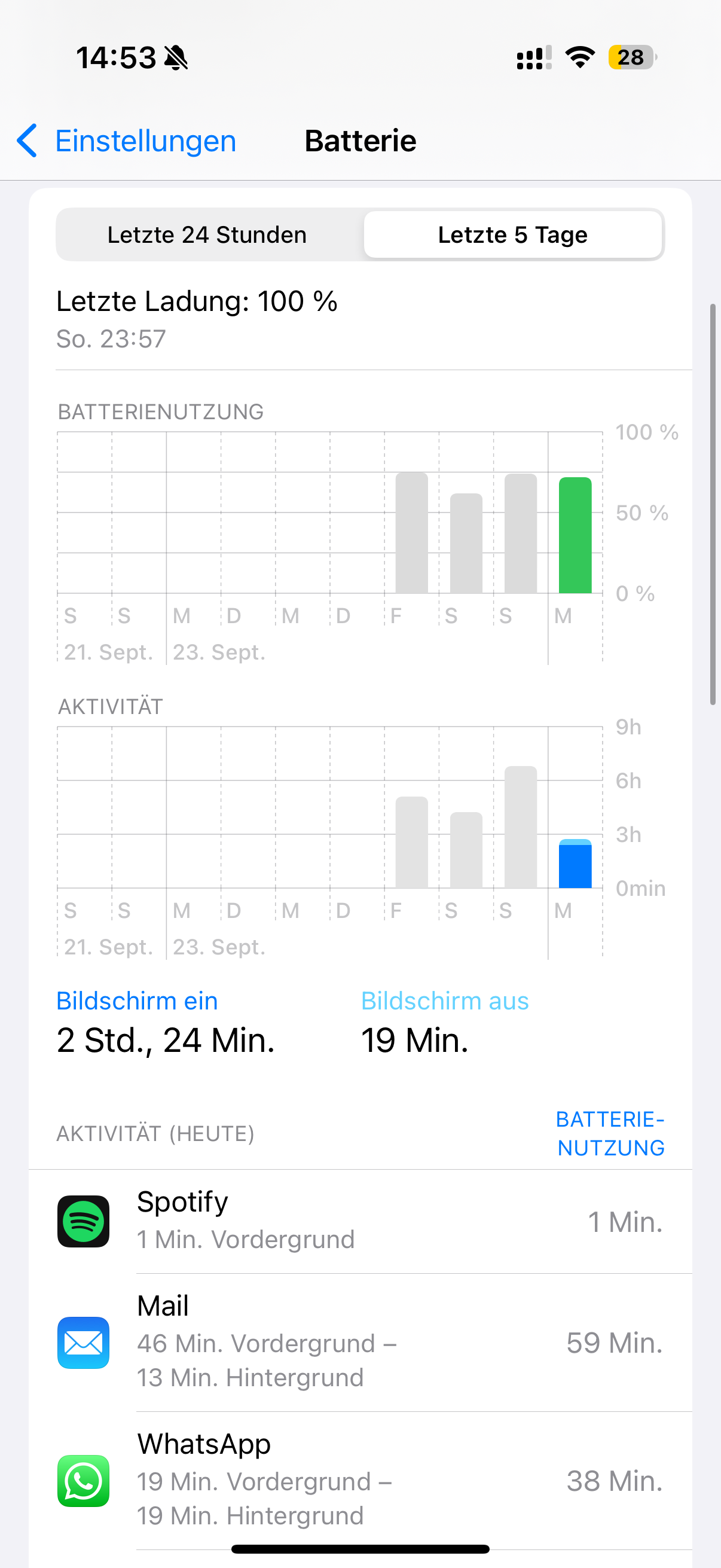 Jetzt ist es 15 Uhr und das Handy hat nur noch 28% Akku bei normalem Standard Betrieb. Kein telefonieren, kein Streaming. Nur Mail und etwas Social Media.