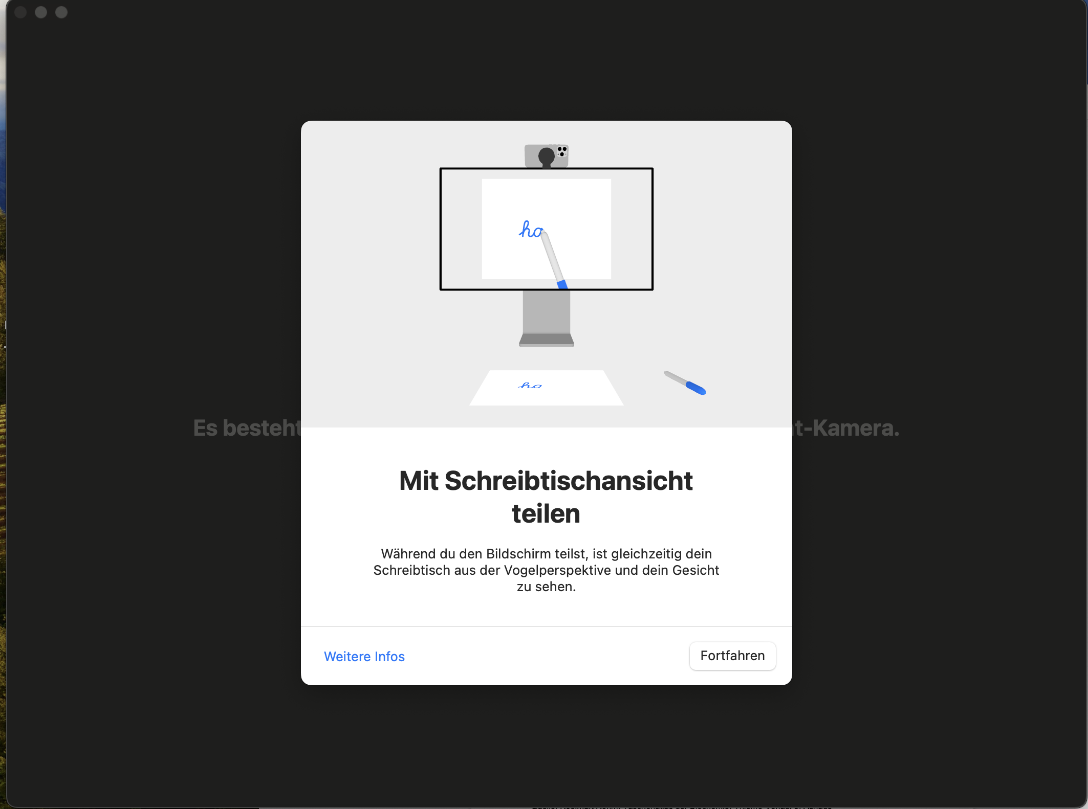 Ich kann weder auf "Fortfahren" klicken noch kann ich das Fenster schließen. command + Q geht auch nicht und herunterfahren kann ich das MacBook auch nicht. Auf meinem iPhone hab ich es schon deaktiviert das mein Mac mein iPhone als Kamera verwenden kann.