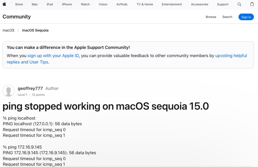Auch an"Ping"en geht unter macOS 15 Sequoia nicht mehr.