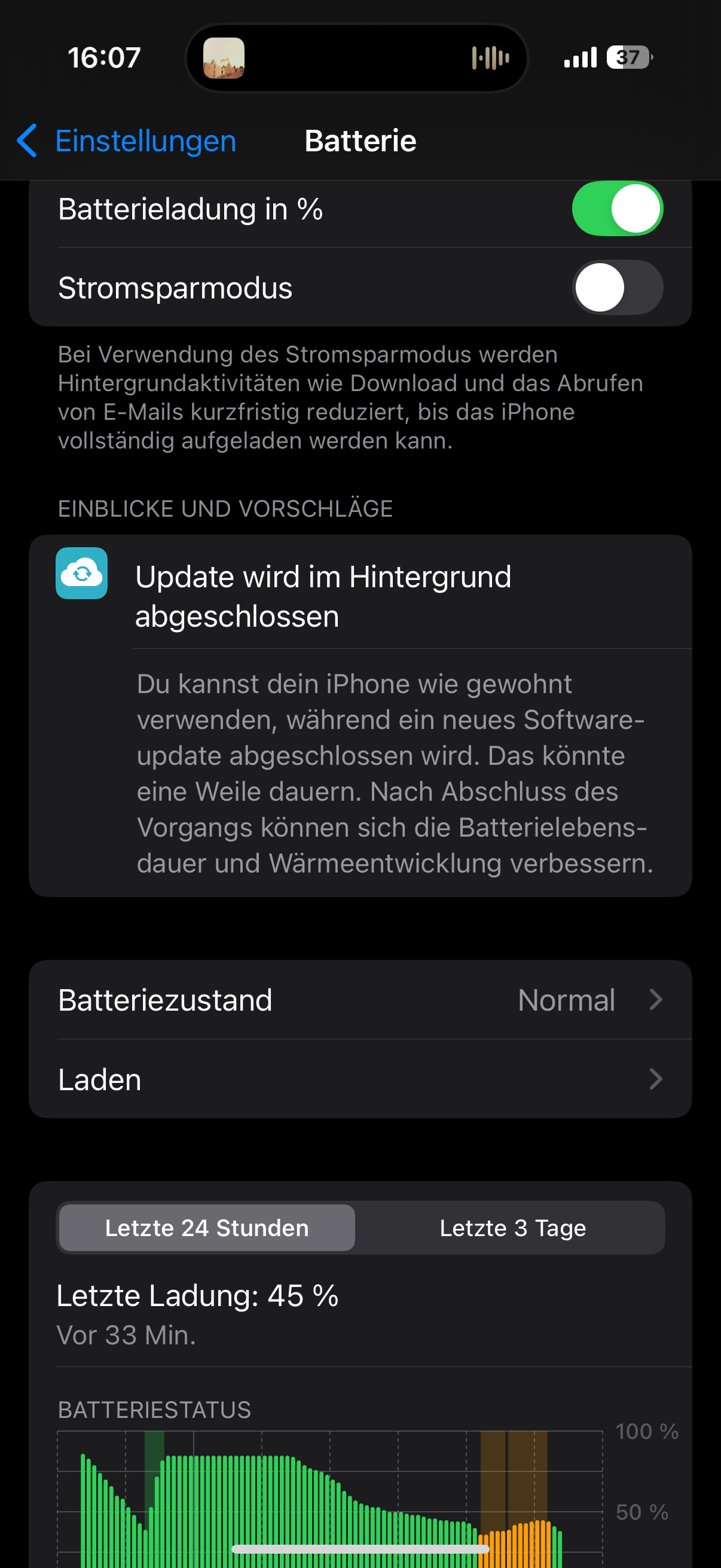 ich habe seit gestern ein neues iPhone (16 Pro). In den Einstellungen für die Batterie wird mir angezeigt, „Update wird im Hintergrund abgeschlossen“