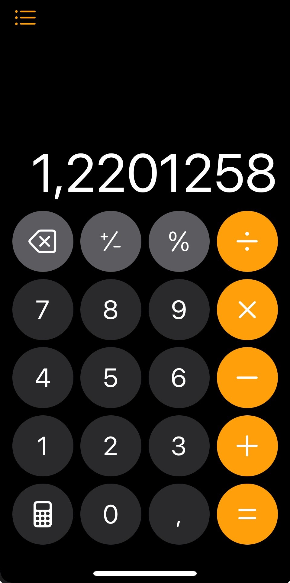 Wenn ich den iPhone Taschenrechner öffne, wird immer die Zahl 1,2201258 angezeigt. Lösche ich den Verlauf und öffne den Rechner erneut, steht wieder diese Zahl da, die ich erst per Löschtaste löschen muss. Seltsam.