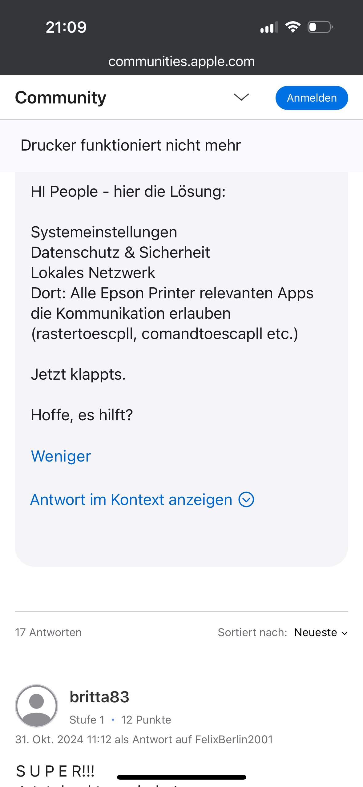 mein Epson Drucker der mit dem WLAN verbunden ist, druckt seit dem letzten Update nicht mehr.