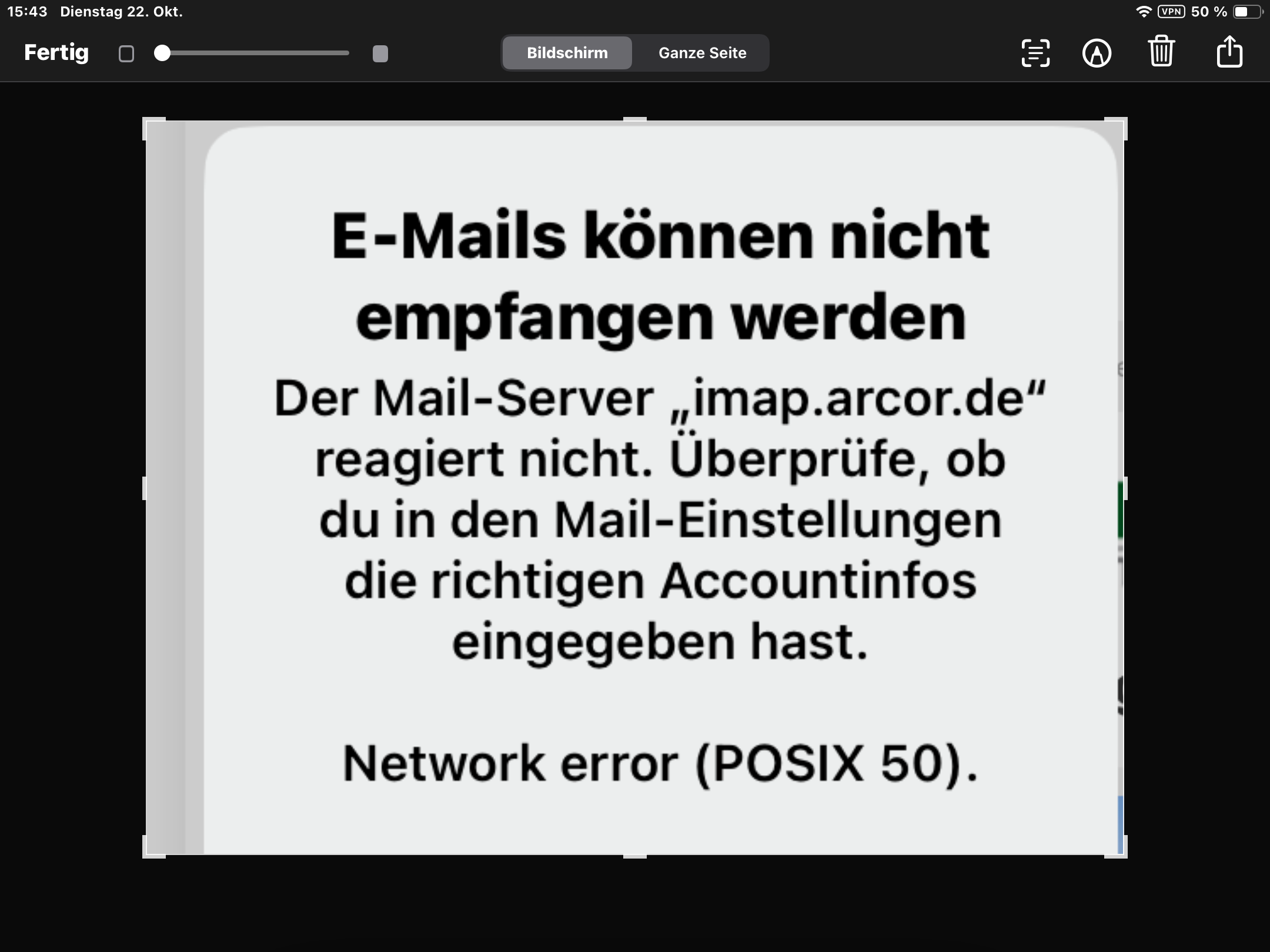 Seit Update auf iOS 18.0.1 Probleme beim Abrufen vom Arcor Mailserver