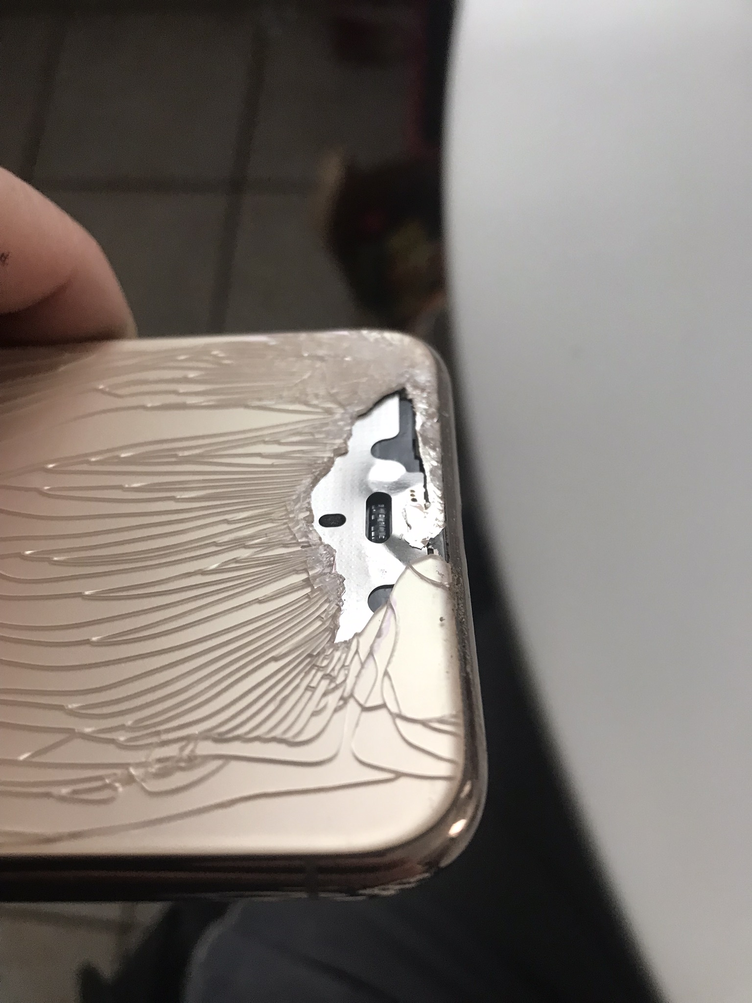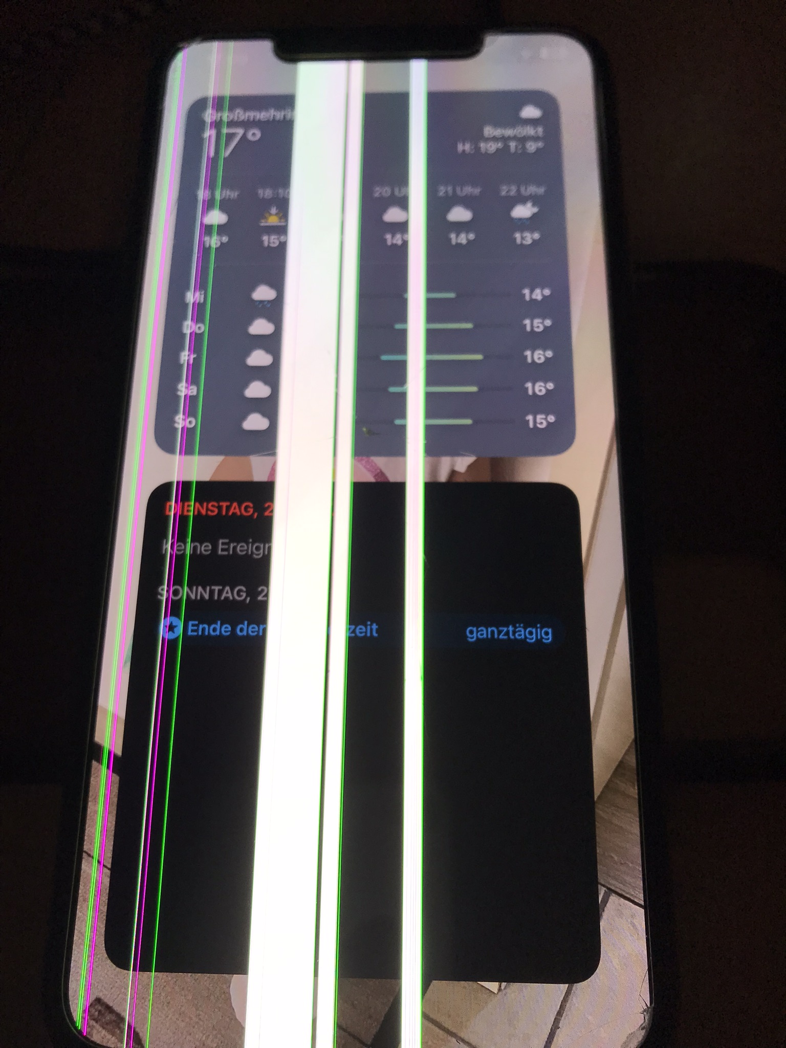 Plötzlich machte es einen knacks, und als ich auf Die "Uhr" schauen wollte habe ich plötzlich weiße streifen von oben nach unten auf meinem Display festgestellt... Zuhause stellte ich dann fest, das die Rückseite auch komplett zersprungen ist, und am Lightning Anschluss etwas angewölbt ist! Ich denke dadurch entstand der Fehler...