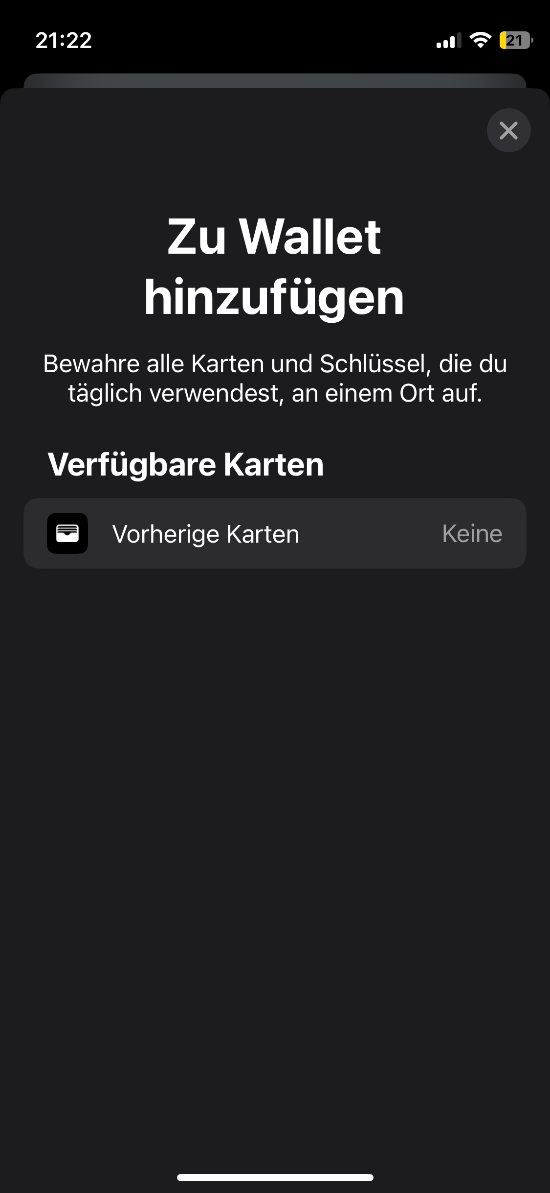 Ich kann keine Karten zu Apple Pay hinzufügen. Wenn ich eine Karte hinzufügen will, steht da nur vorherige Karte und nicht Karten hinzufügen.
