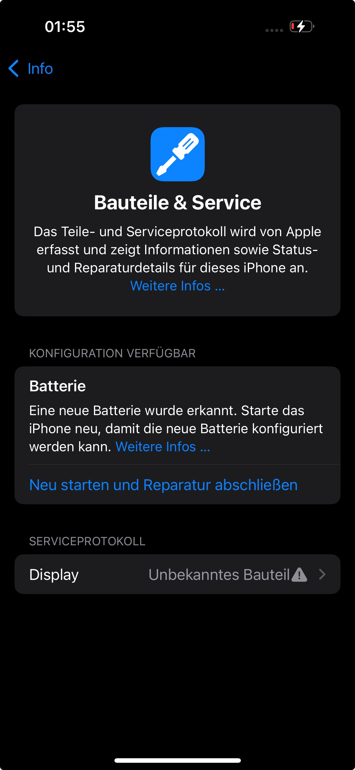 Mir blieb nichts anderes übrig, als das Display auf eigene Kosten erneut austauschen zu lassen. Nach dem Einbau trat jedoch eine weitere Fehlermeldung auf: Der Akku wurde nicht mehr erkannt, und der Service Mitarbeiter hat mir mitgeteilt, dass im Inneren des Gerätes verbogene Clips und Schäden an den Flex Kabelverbindung Vorlagen.