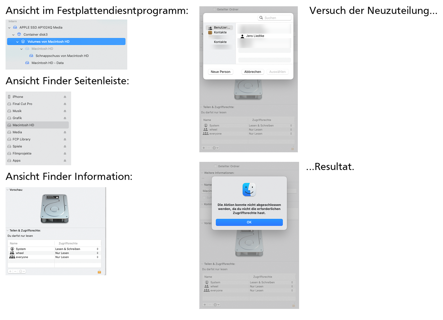 Wenn ich in der Seitenleiste des Finders die Macintosh HD auswähle, um im Informationsfenster die Zugriffsrechte zu überprüfen und ggf. neu zu setzen, erscheint immer nur die Meldung: