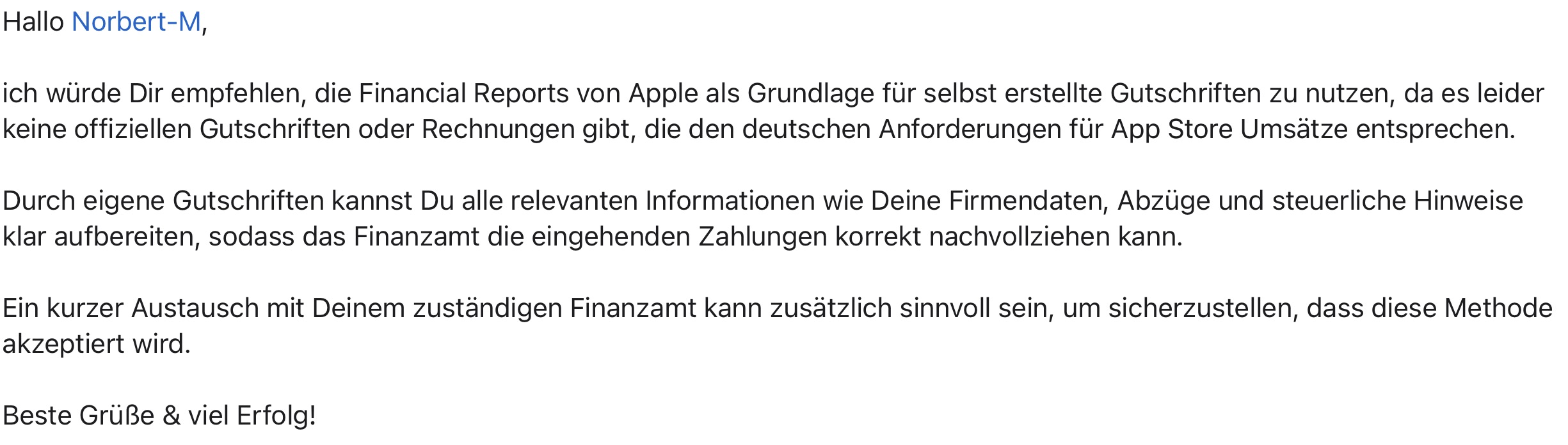 Leider finden wir keine Möglichkeit, ordentliche, vom Finanzamt akzeptierte Gutschriften von Apple über die generierten Umsätze zu bekommen.
