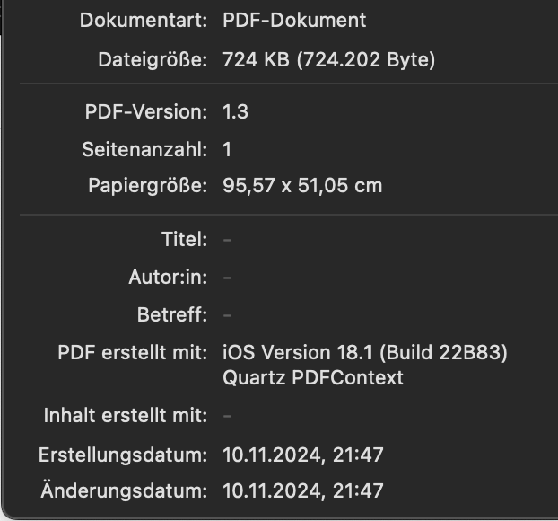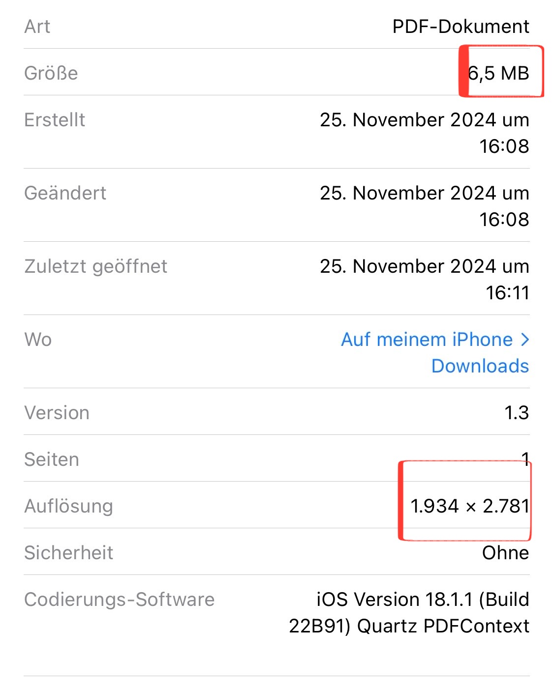 Ich habe nach dem Update auf iOS 18.1 festgestellt, dass die Größe der gescannten Datei über die Notizen-App jetzt 6-8 MB beträgt, während sie früher 500 kB war und die Auflösung 612 x 792 betrug, jetzt jedoch 1.962 x 2.827 ist. Können Sie mir bitte sagen, wie ich das beheben kann, damit die Größe wieder so klein wie früher wird?