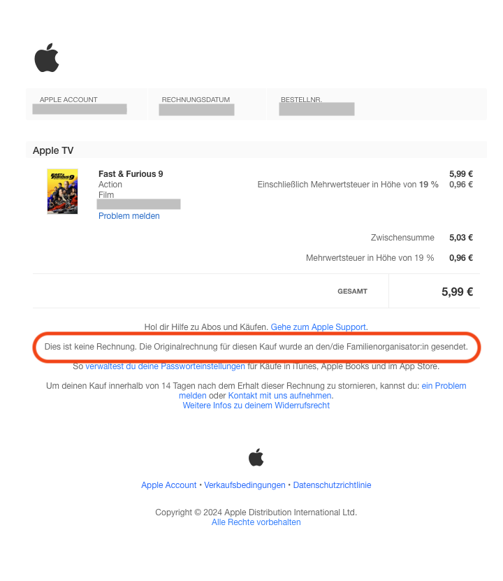 Und hier siehst du einmal Rechnung für den App Store und den iTunes Store, diese unterscheiden sich etwas, hier gibt es einmal die Rechnung und dann noch die Kaufbestätigung, letztere wird an Familienmitglieder einer Apple Familienfreigabe versendet, die aber nicht der Organisator sind: