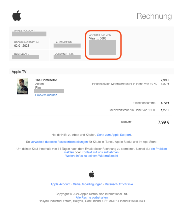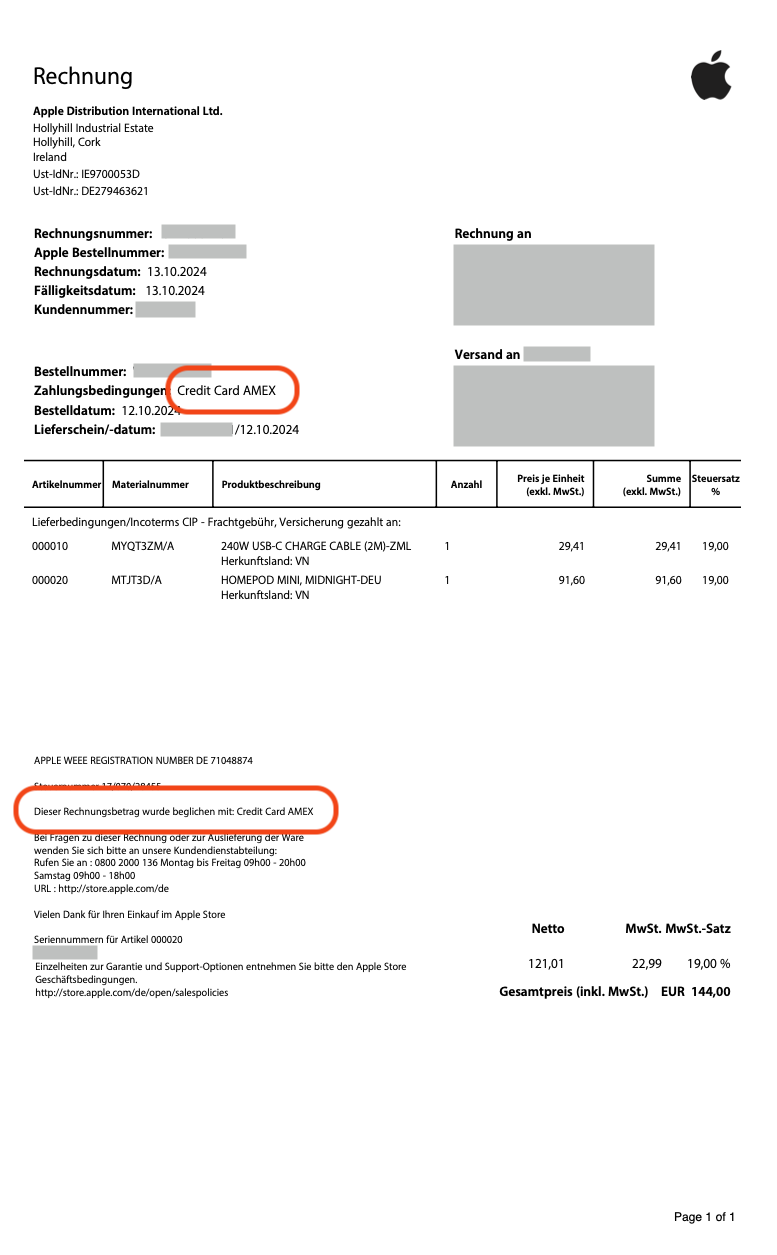 Schau mal hier, auf der Rechnung steht wie bezahlt worden ist, hierbei handelt es sich um eine Rechnung vom Apple Store: