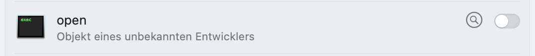 «Open» wird als Objekt eines unbekannten Entwicklers unter Anmeldeobjekte angezeigt