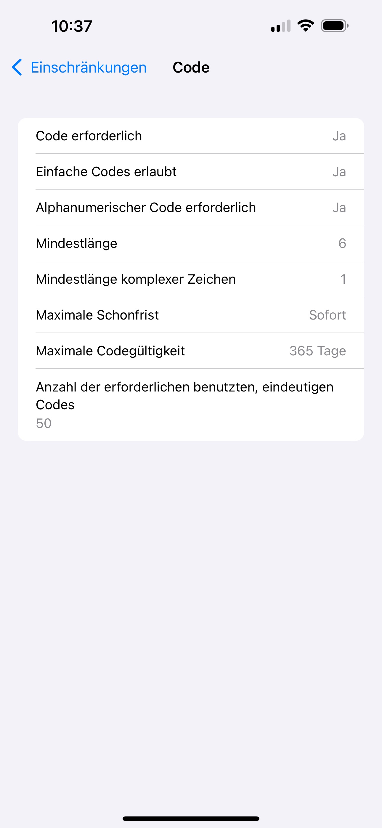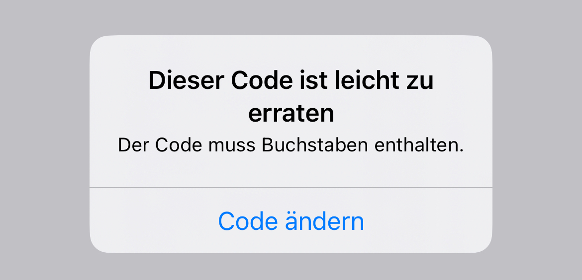 Bei Eingabe von neuem Sperr-Code kommt "Dieser Code ist leicht zu erraten. Der Code muss Buchstaben enthalten"