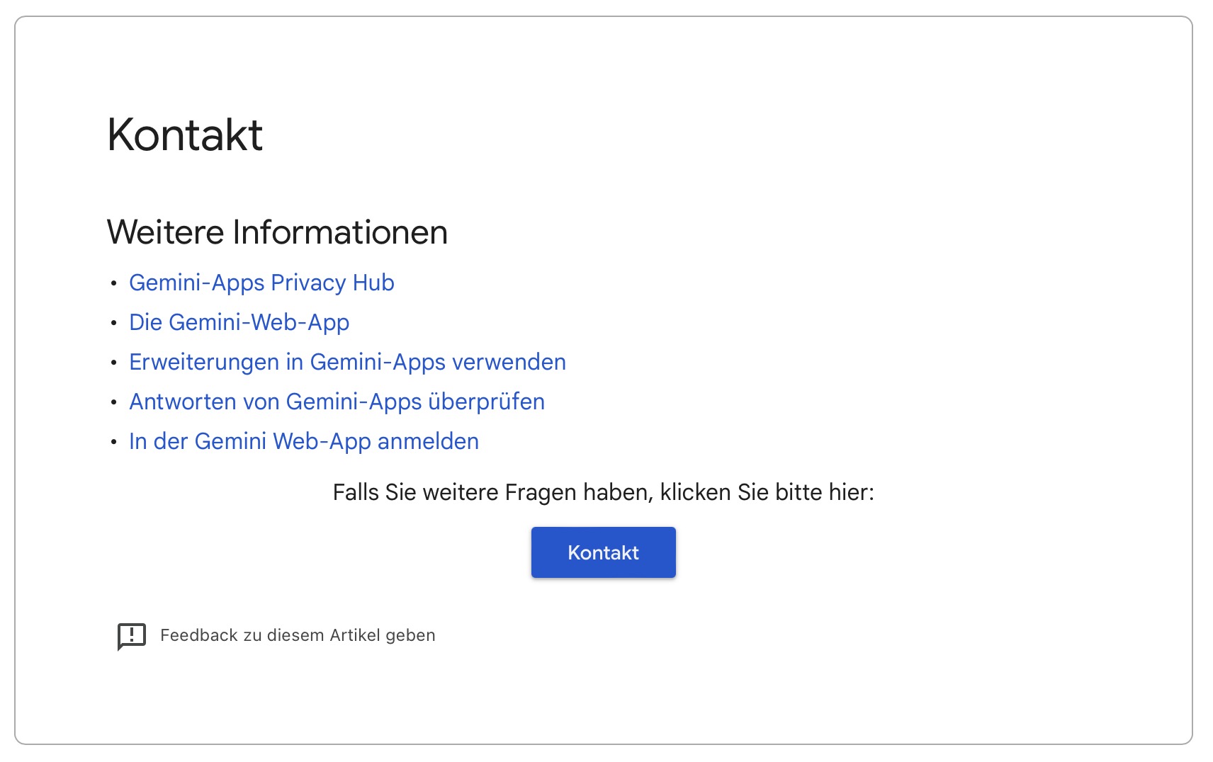 Sollte das alles nichts ändern, empfehle ich, direkt den Support von Google Gemini zu kontaktieren, da sie möglicherweise weitere Hinweise oder eine Lösung für dieses Problem haben.