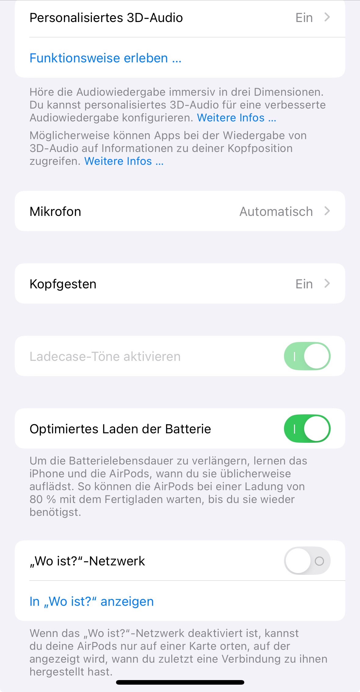 Der einen Ausschalter für die Ladecase-Töne ist bei mir immer grün, also ON aber leider grau hinterlegt. Also ich kann es nicht ausstellen.
