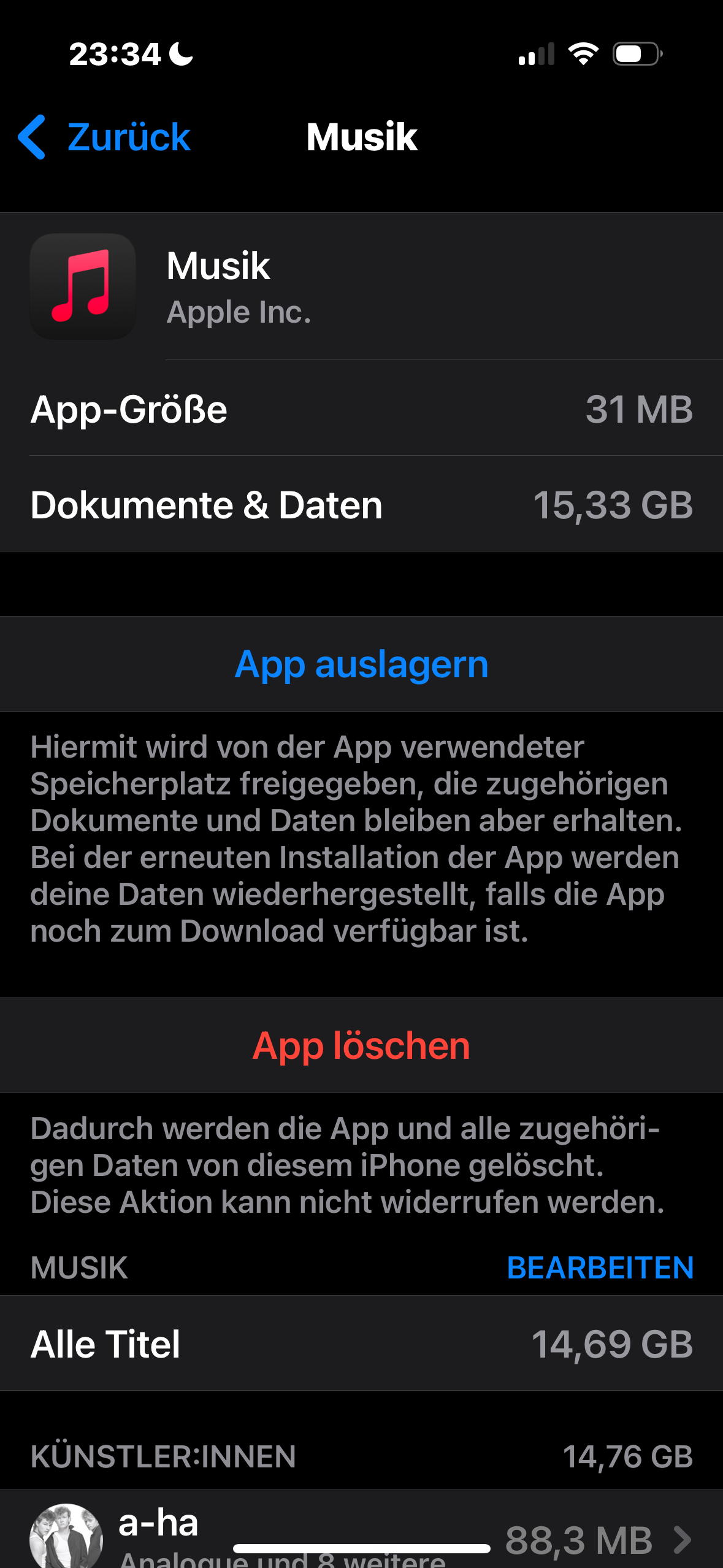 Noch besser ist das Beispiel mit meiner Musik-App. Diese steht in der Liste mit 15,37 GB ganz oben auf Platz 1.