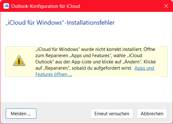 „iCloud für Windows“ wurde nicht korrekt installiert. Öffne zum Reparieren „Apps und Features“, wähle „iCloud Outlook“ aus der App-Liste und klicke auf „Ändern“. Klicke auf „Reparieren“, sobald du aufgefordert wirst.