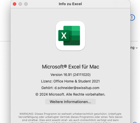 Kein macOS-Update machen, bevor das geklärt ist. MSO ist bei solche Dingen "empfindlich". Du nutzt MSO 2021 (Einzellizenz), das ist rückwärtskompatibel mit Sequoia bis Ventura, das Update ist aktuell. In den Release-Notes dazu kann ich nichts über Fehler in Excel finden, auch in älteren nicht. Betrifft das Problem nur Excel oder auch andere MSO-Formate (z.B. Word)?