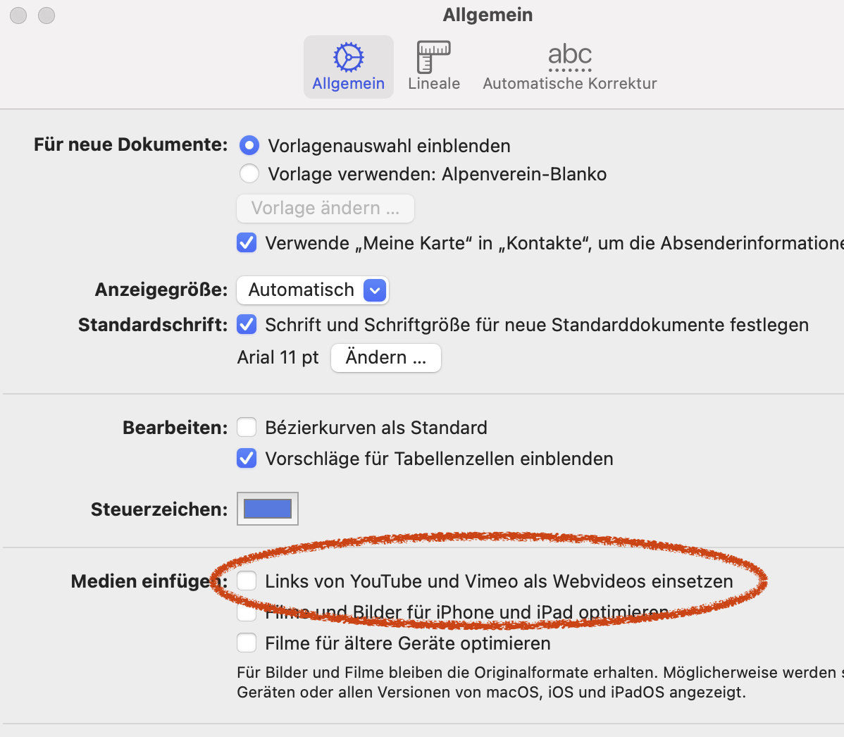 Dort findest Du den Punkt Medien einfügen. Unter "Links von YouTube und Vimeo als Webvideos einsetzen" (siehe Screenshot) darf kein(!) Haken gesetzt sein. Wenn das so ist, solltest Du den Link problemlos einsetzen können und er führt Dich zum externen Video.