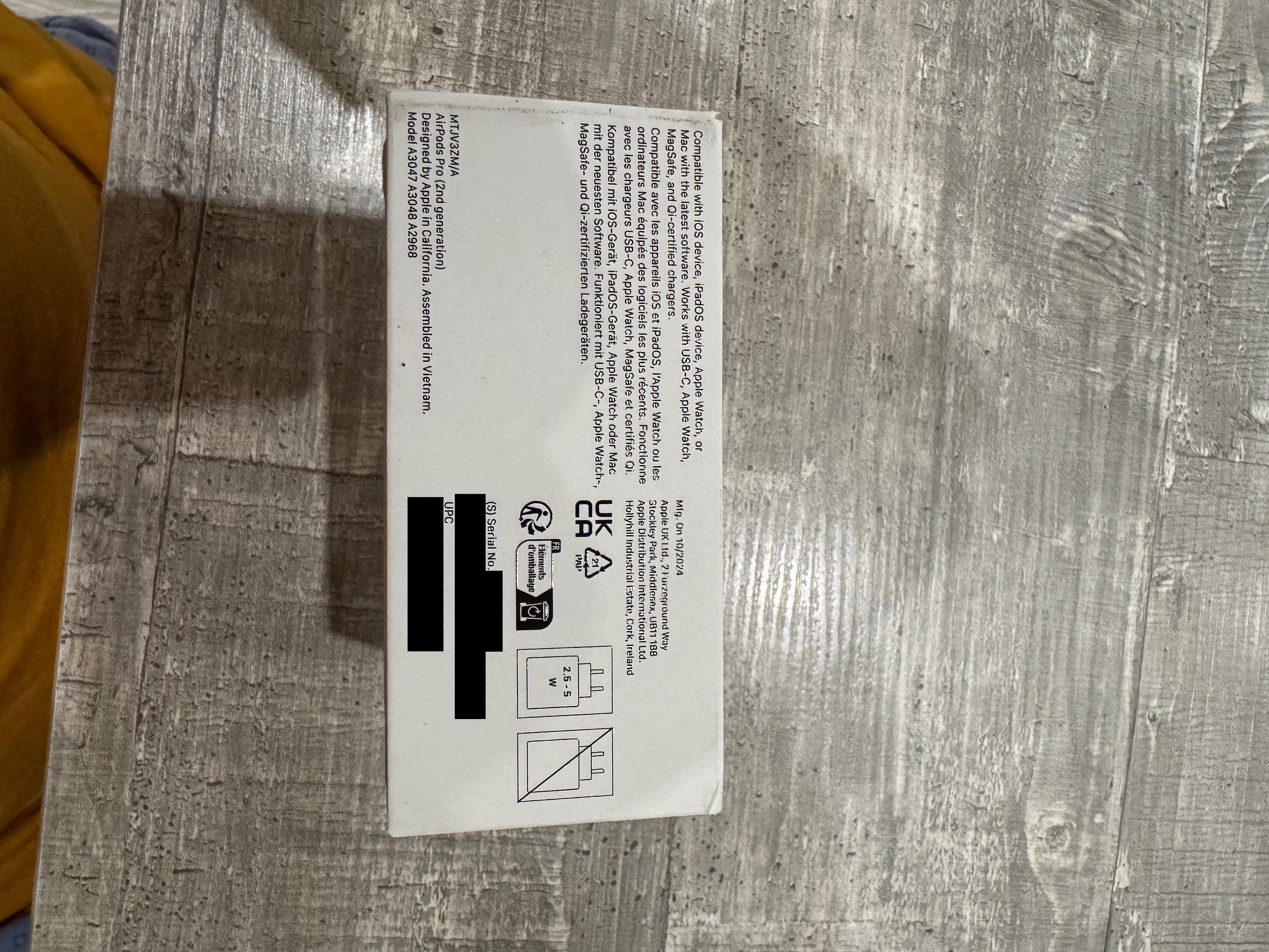 Auf der anderen Seite sieht die Verpackung schlecht verarbeitet aus, wir kennen von Apple eigentlich hier hochwertigere Verklemmungen. Außerdem ist das meines Erachtens auch keine einheitliche Schriftart auf dem Sticker. Zusätzlich, und gut das hier unsere Moderatoren zu langsam waren, konnte ich die Seriennummer noch erhaschen, eigentlich sollte man die hier nicht teilen, aber so kann ich damit immerhin arbeiten. Naja, hier sehen wir das wir kein verifiziertes Kaufdatum haben, und das ist bei AirPods die auf Amazon gekauft werden nicht so, die sollten da das Kaufdatum eintragen. Sind so viele kleine Dinge die irgendwie nicht passen.