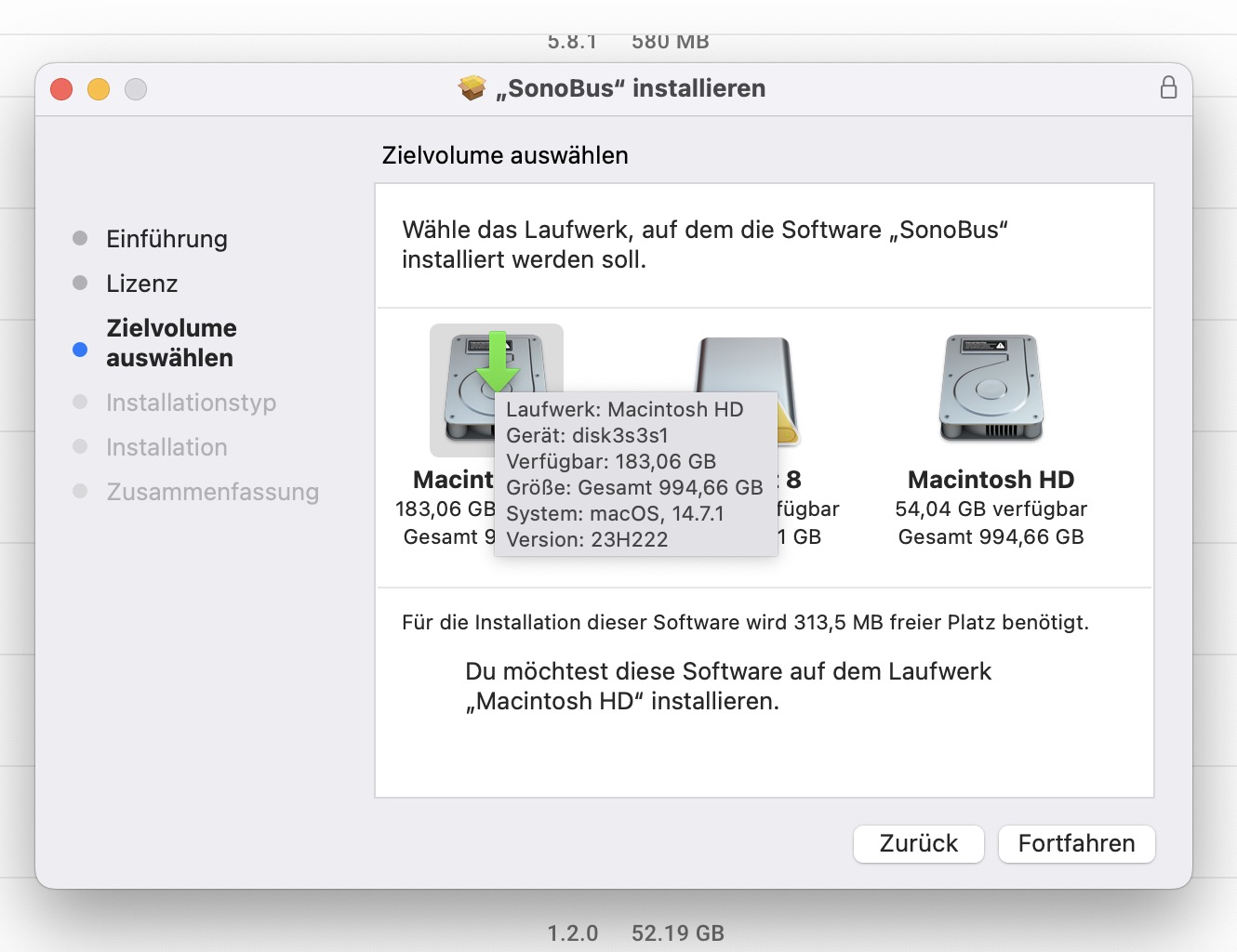 Software-Installation zeigt MacintoshHD Sonoma und Sequoia an