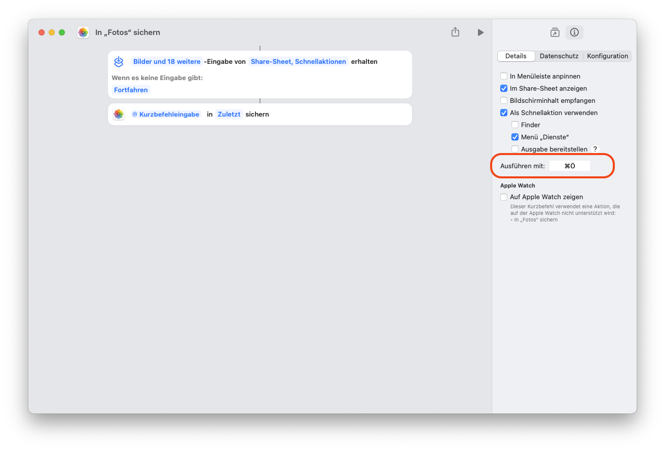 Sprich einmal das Foto auf dem Desktop ablegen lassen ,dann in Vorschau öffnen (also einfach Doppelklick) und dann diesen Kurzbefehl ausführen lassen: https://www.icloud.com/shortcuts/935c51c50fcd45238cc9c03a572e1eee. Wenn du das ganze als Tastaturkurzbefehl haben willst gehen auf dem Kurzbefehl so das du da Aktionen hinzufügen könntest. Oben rechts siehst du ein i in einem Kreis, gehe da rauf. Hier findest du unter Ausführen mit ein leeres Feld, gehe da rauf und gebe dann einen Tastenkombination an, beispielsweise ⌘ Ö, das nutzt ja sonst keine andere App: