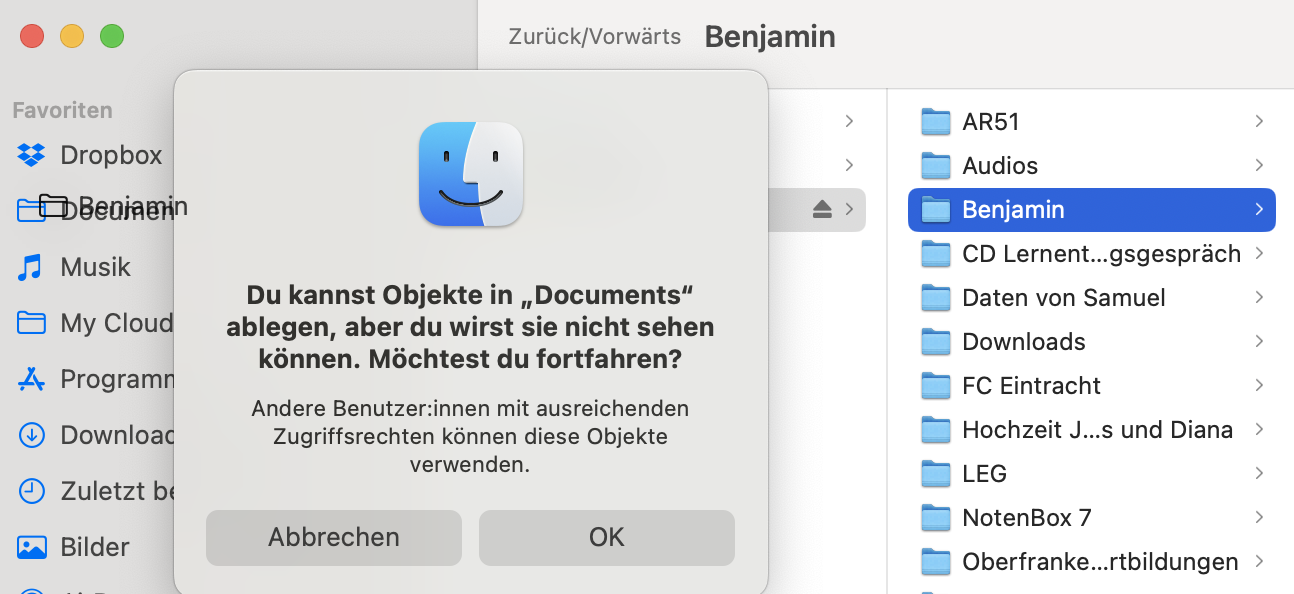 Wenn ich eine Anwendung starte, kann ich die letzten verwendeten Objekte noch öffnen, habe aber weder über "Öffnen" noch über den Finder Zugriff auf alle Dateien.