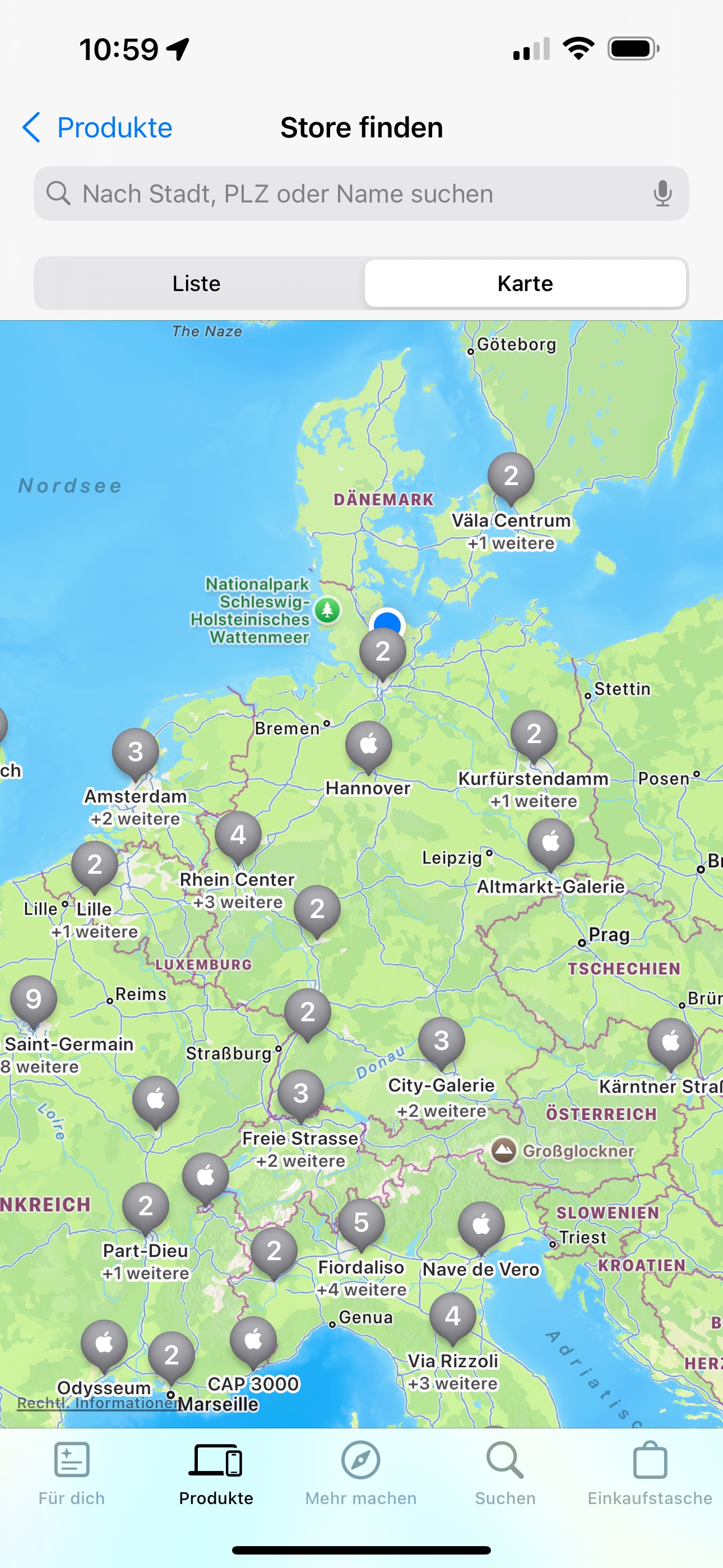 Hast du ein iPad oder so, geht auch am iPhone? Gehe dort in die Apple Store App, dann unten im Reiter auf Produkte. Scrolle hier nach ganz unten und tippe auf „Apple Store finden“, dort kannst du von Liste auf Karte wechseln.