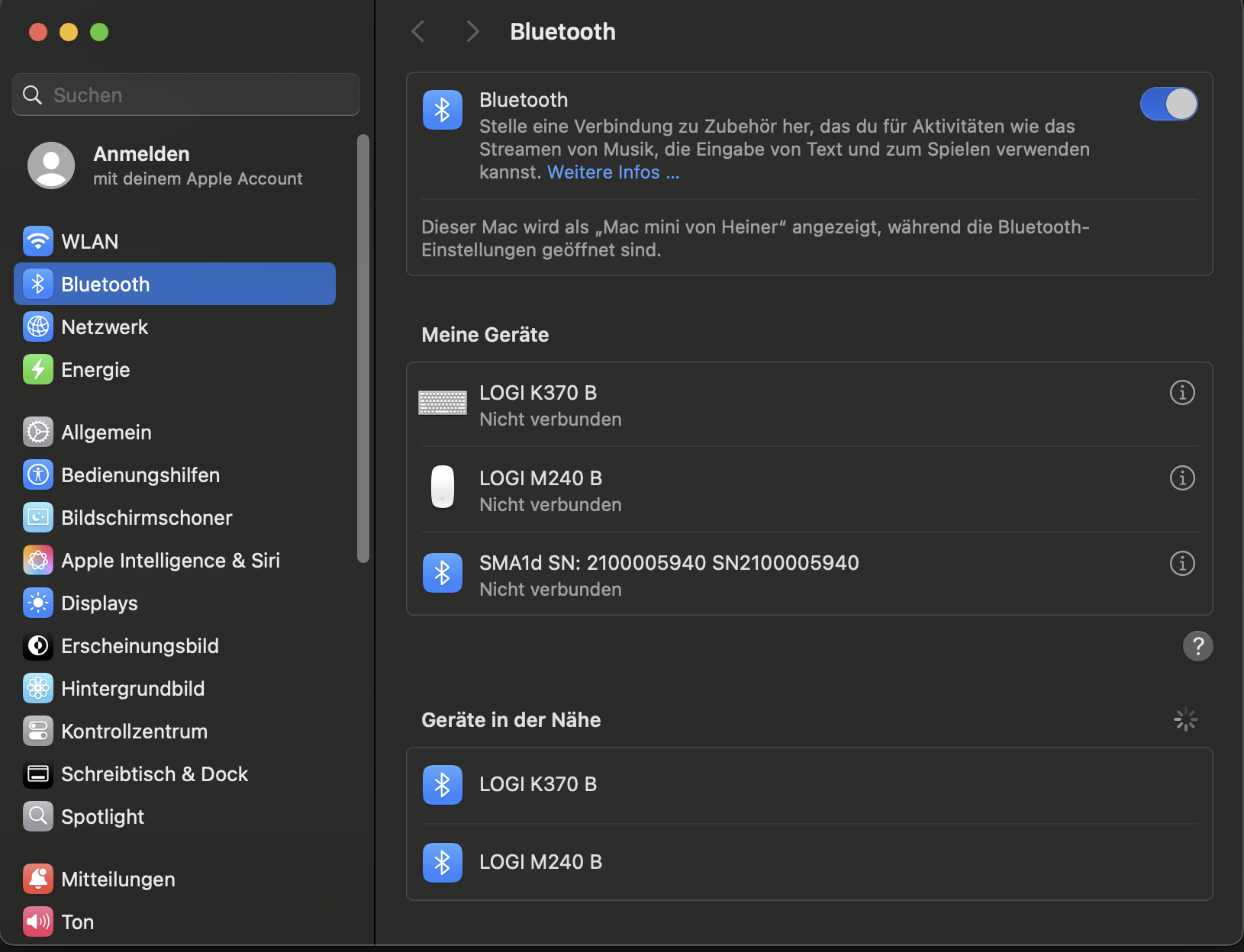Ich habe eine Bluetooth Tastatur & Maus von Logitech (MK370 Combo) mit meinem neuen Mac Mini 4 per Bluetooth verbunden. Das hat einwandfrei funktioniert. Nach dem Neustart des Mac mini aus dem Ruhezustand findet er aber beide Geräte nicht mehr. Sie stehen zwar in den Bluetooth Einstellungen, die Verbindung erfolgt aber nicht automatisch. Ich muß also zuerst mit einer USB-Tastatur den Anmeldebildschirm überwinden um dann die beiden Geräte in den Bluetooth Einstellungen wieder neu anzumelden.