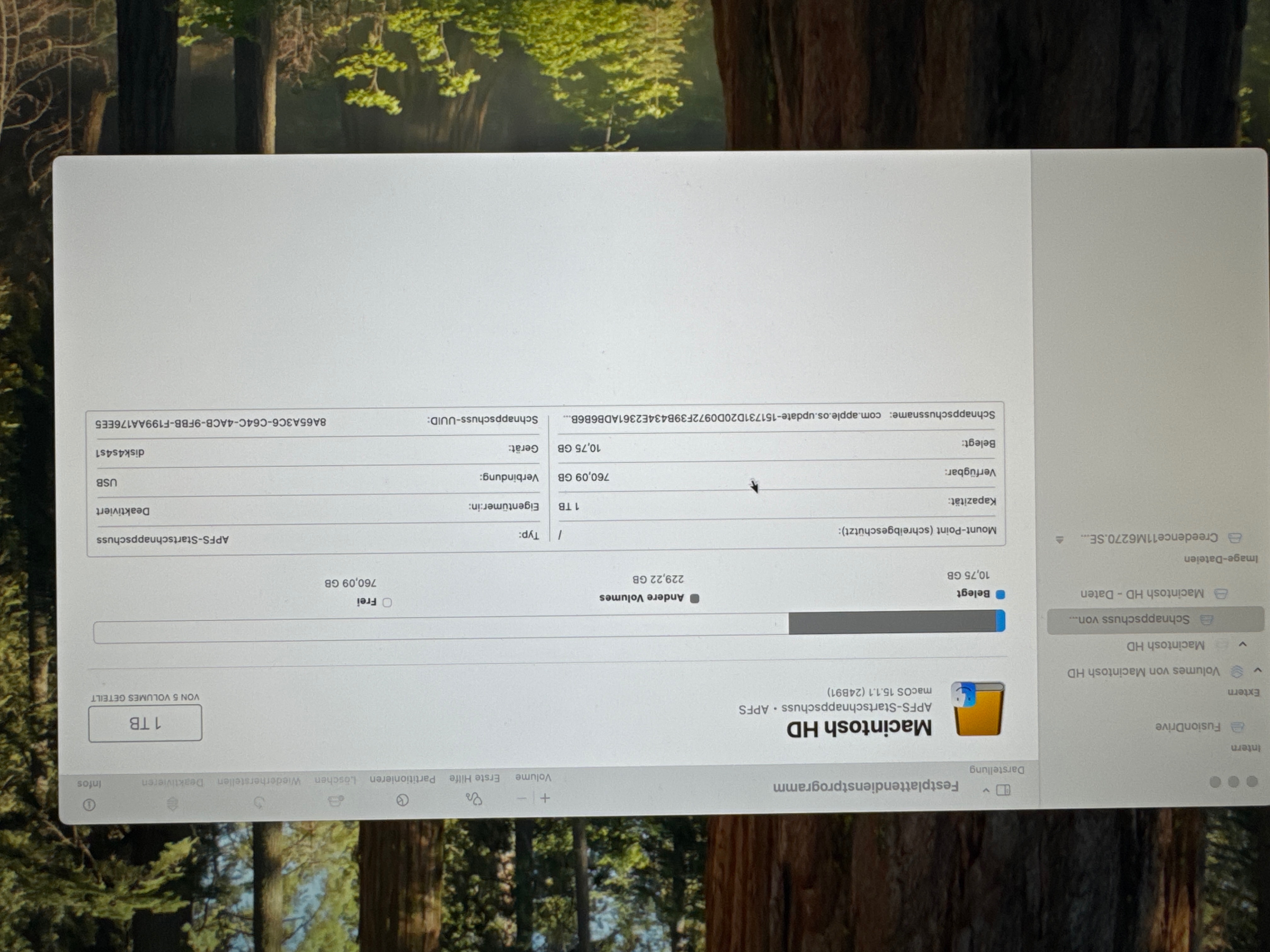Das MacOS wird aus Geschwindigkeitsgründen von einer externen Crucial SSD gestartet, was auch gut funktioniert. Das Fusion Drive nutze ich für Backups via Time Machine. Zusätzlich ist ein 4K Samsung Monitor angeschlossen.