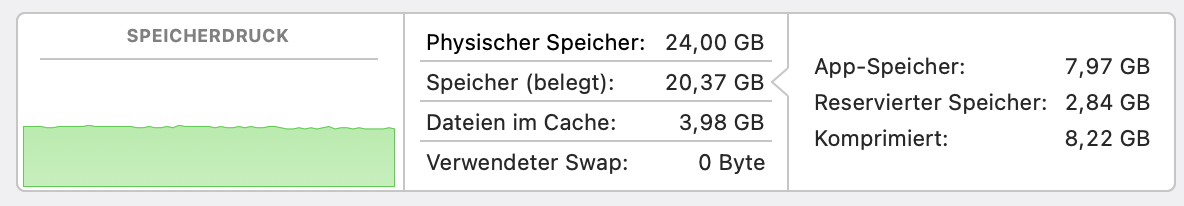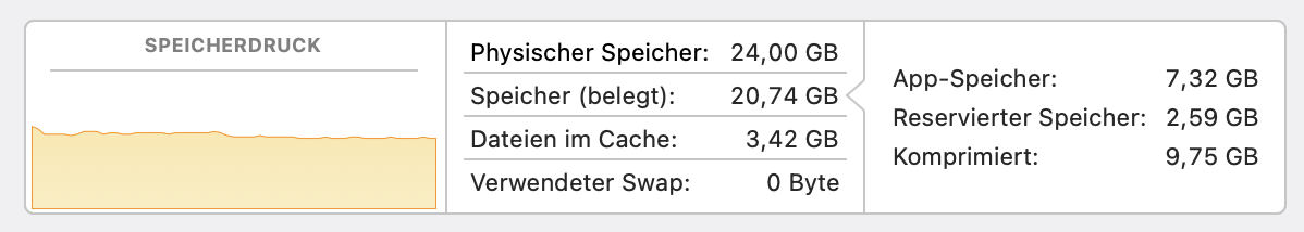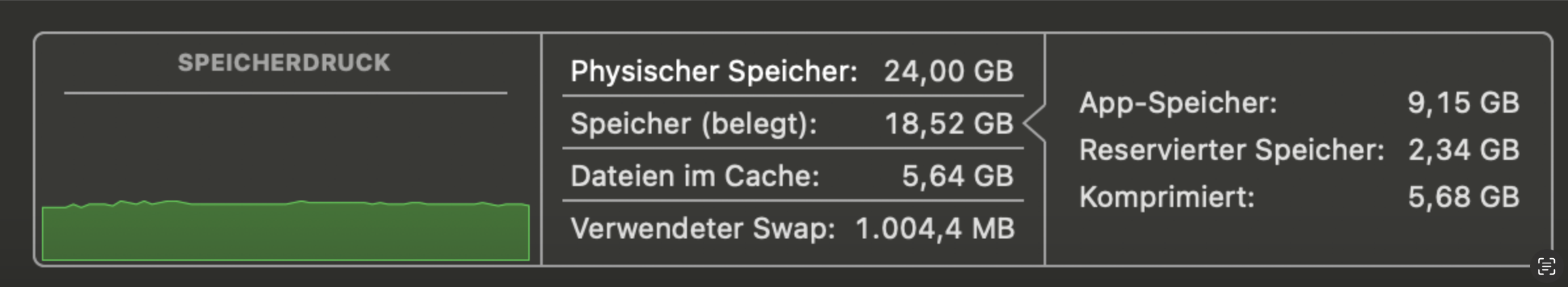 Im Normalbetrieb liege ich konstant bei etwa 20GB RAM-Auslastung, was noch im grünen Bereich ist. Aber mindestens einmal täglich sehe ich, dass der RAM in den gelben Bereich geht. Anbei mal Screenshots aus 3 Alltagssituationen. Dabei dachte ich eigentlich, dass 24GB für meine Anforderungen mehr als ausreichend wären – ich halte mich nicht mal für einen Heavy User, oder? Gefühlt bin ich nur ein anspruchsvoller Office Nutzer der halt den ganzen Tag am Mac arbeitet.