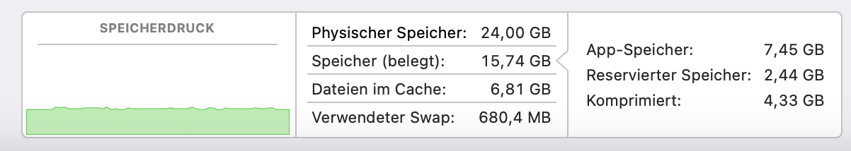 Im Normalbetrieb liege ich konstant bei etwa 20GB RAM-Auslastung, was noch im grünen Bereich ist. Aber mindestens einmal täglich sehe ich, dass der RAM in den gelben Bereich geht. Anbei mal Screenshots aus 3 Alltagssituationen. Dabei dachte ich eigentlich, dass 24GB für meine Anforderungen mehr als ausreichend wären – ich halte mich nicht mal für einen Heavy User, oder? Gefühlt bin ich nur ein anspruchsvoller Office Nutzer der halt den ganzen Tag am Mac arbeitet.