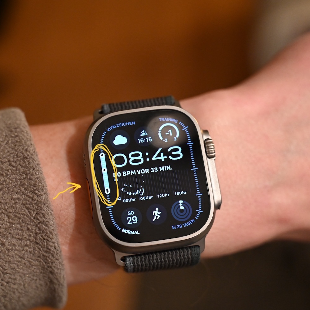 Ich habe im neuen watchOS 11.2 (22S101) für meine Apple Watch Ultra 2 entdeckt, dass man statt Höhe/Tiefe auf der Lünette auch "Training" aktivieren kann. Nun wird auf meiner Lünette links etwas angezeigt, was ich nicht richtig zu lesen verstehe. Dort sind drei Punkte (einer davon auch meist etwas länglich), die auf der Skala von Tag zu Tag auf und ab wandern.