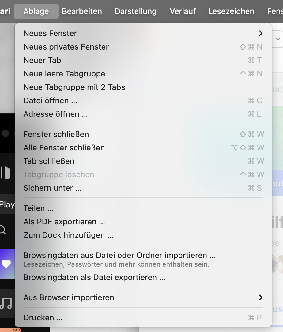 Überall finde ich Anleitungen, die sagen, ich soll unter Safari > Ablage > Exportieren Lesezeichen.