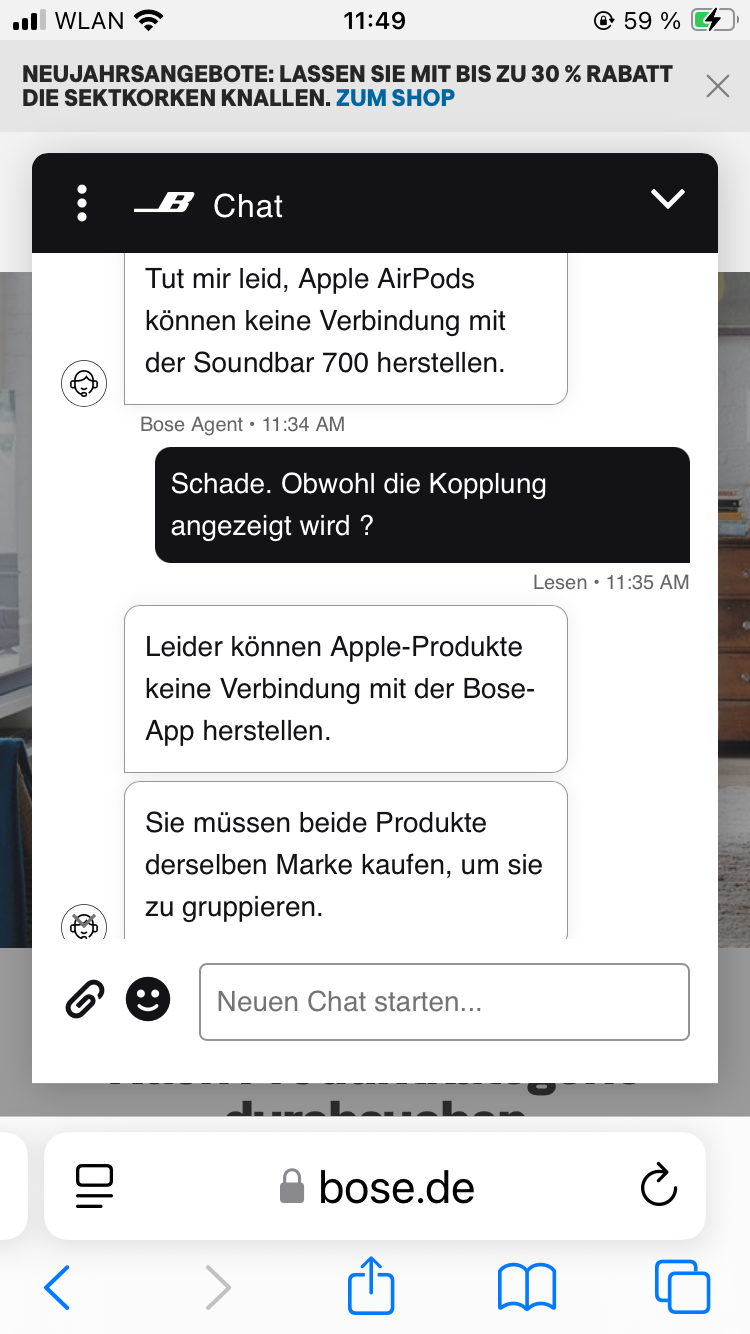 Ich habe das selbe Problem mit meinen AirPods pro2. Die Bose Soundbar 700 App zeigt an das die Kopplung funktioniert hat. Die AirPods werden auch angezeigt und die Lautstärke lässt sich auch separat steuern. Nur es kommt kein Ton an.