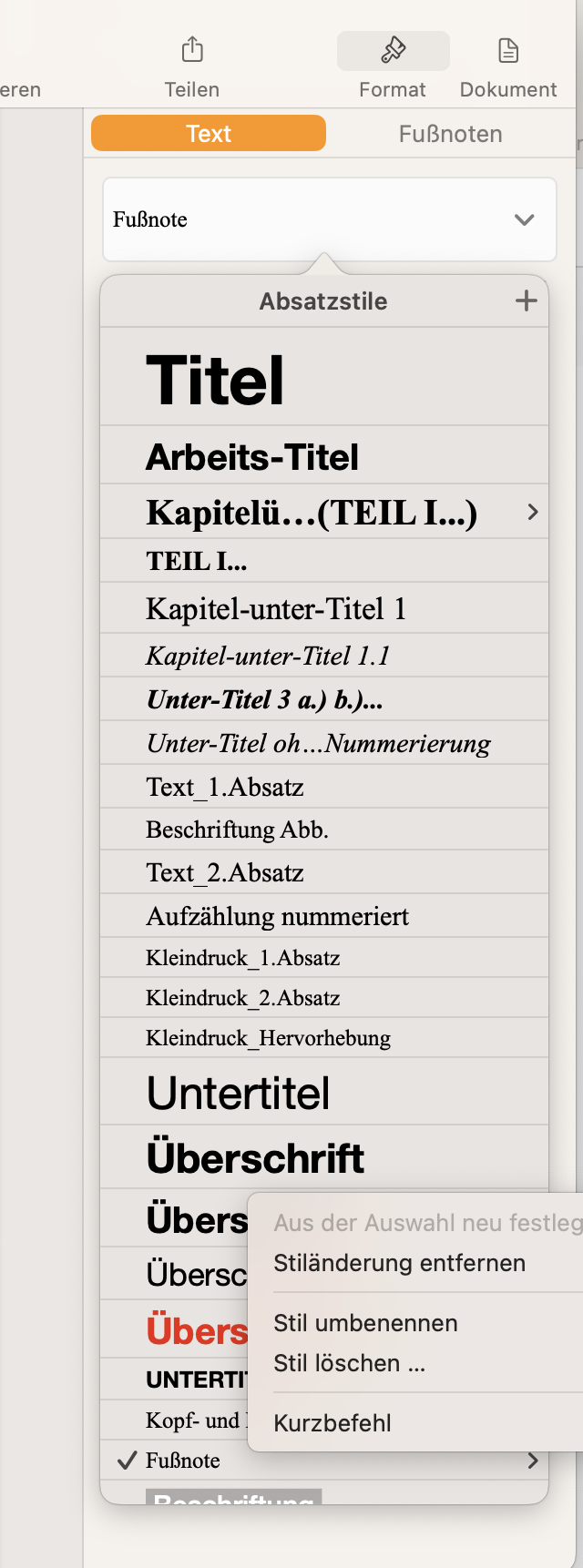4. geh´ dann zum Absatzstil Fußnote, rechts daneben sollte ein Pfeil/Dreieck zu sehen sein, das dich zu einem weiteren Sub-Menü führt (siehe Screenshot)