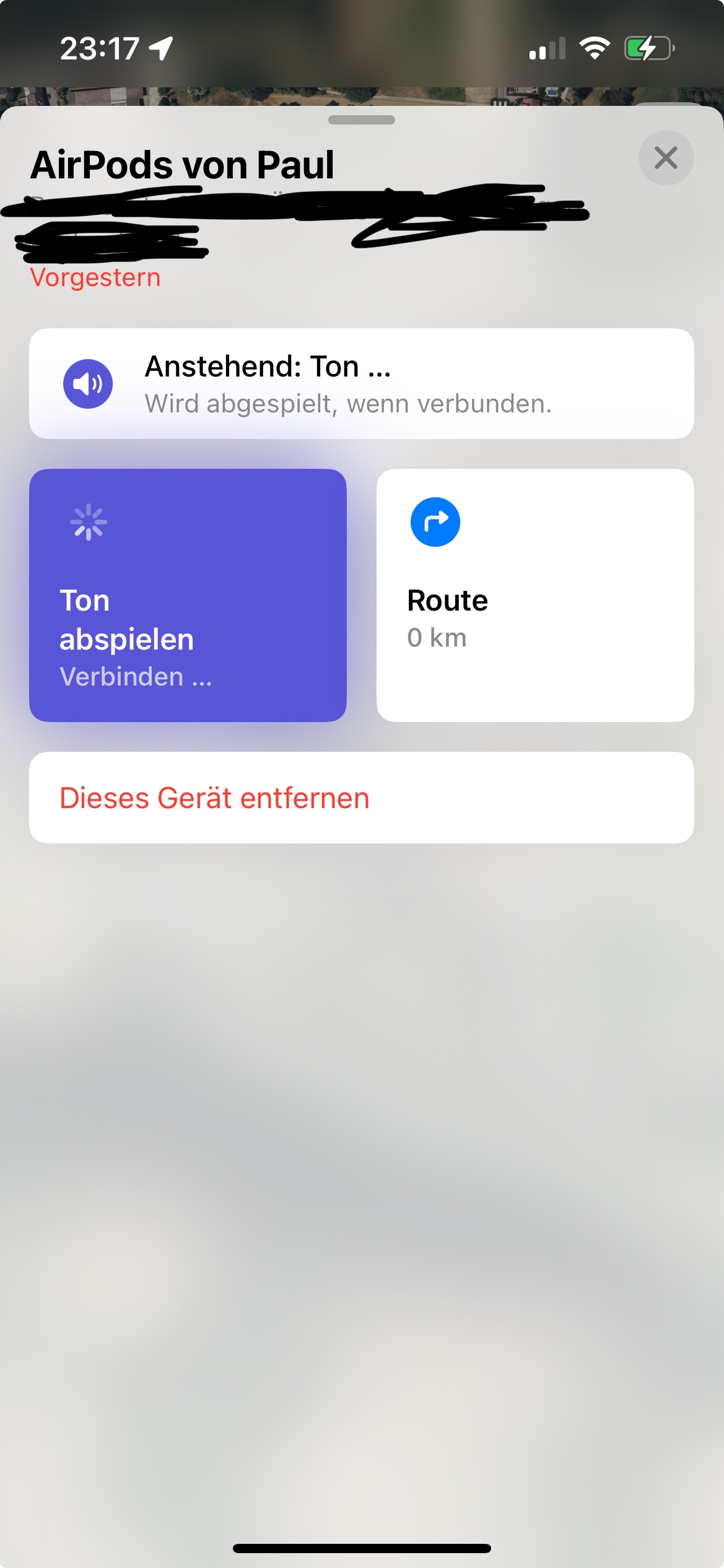 Ich habe zu Wheinachten neue AirPods bekommen (ich glaube 4er) und auf einmal sind sie weg unten ist ein Bild ich hatte meine AirPods nicht vorgestern bei mir sondern gestern habe ich sie sogar in der Hand gehabt. Aber weil sie nicht in der Nähe sind (obwohl 0km dasteht) und was weiß ich, kann ich sie nicht als verloren melden. Es kann auch nicht sein, dass ich in deren Nähe bin, sonst würde ein Ton angezeigt werden. Was soll ich denn jetzt tun, bzw. gibt es noch andere Möglichkeiten außer zu jedem besuchten Ort von gestern zu gehen? (Das Icon wird auch bei meinem Zuhause angezeigt aber es kommt kein Ton der mir Gewissheit gibt dass ich in der Nähe bin) - unten gehts weiter