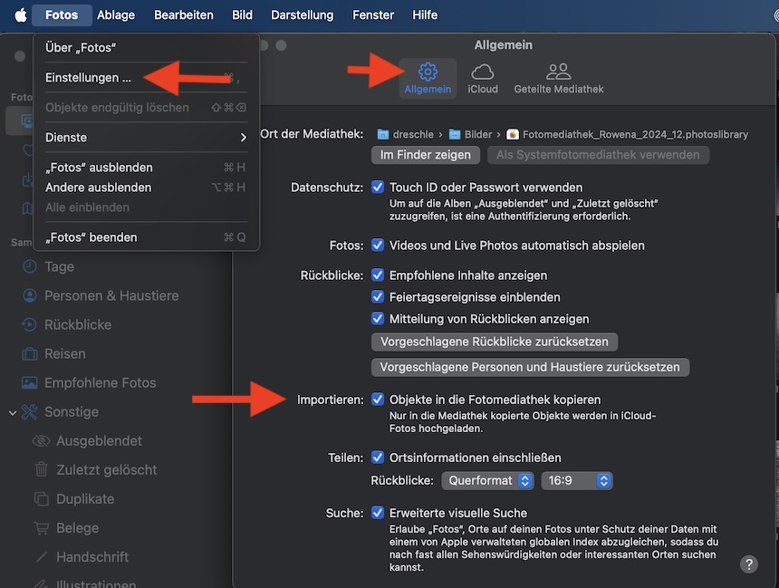 Aber wenn du in den Fotos > Einstellungen, im Reiter "Allgemein" das Häkchen bei "Importieren: Objekte in die Mediathek kopieren" entfernt haben solltest, dann sind eventuell nicht alle Fotos, die du in Fotos siehst, auch in deiner Mediathek gesichert, und du darfst die gescannte Fotodatei auf keinen Fall löschen oder verschieben, da Fotos nur darauf verweist. Das nennt sich "Importieren als verknüpfte Datei". Ich rate dringend davon ab, diese Methode zu verwenden, da man leicht versehentlich die Originale der Bilder löschen kann - früher oder später hat man Probleme, beispielsweise, wenn der Speicherplatz knapp wird und die Originale verschoben werden müssen.
