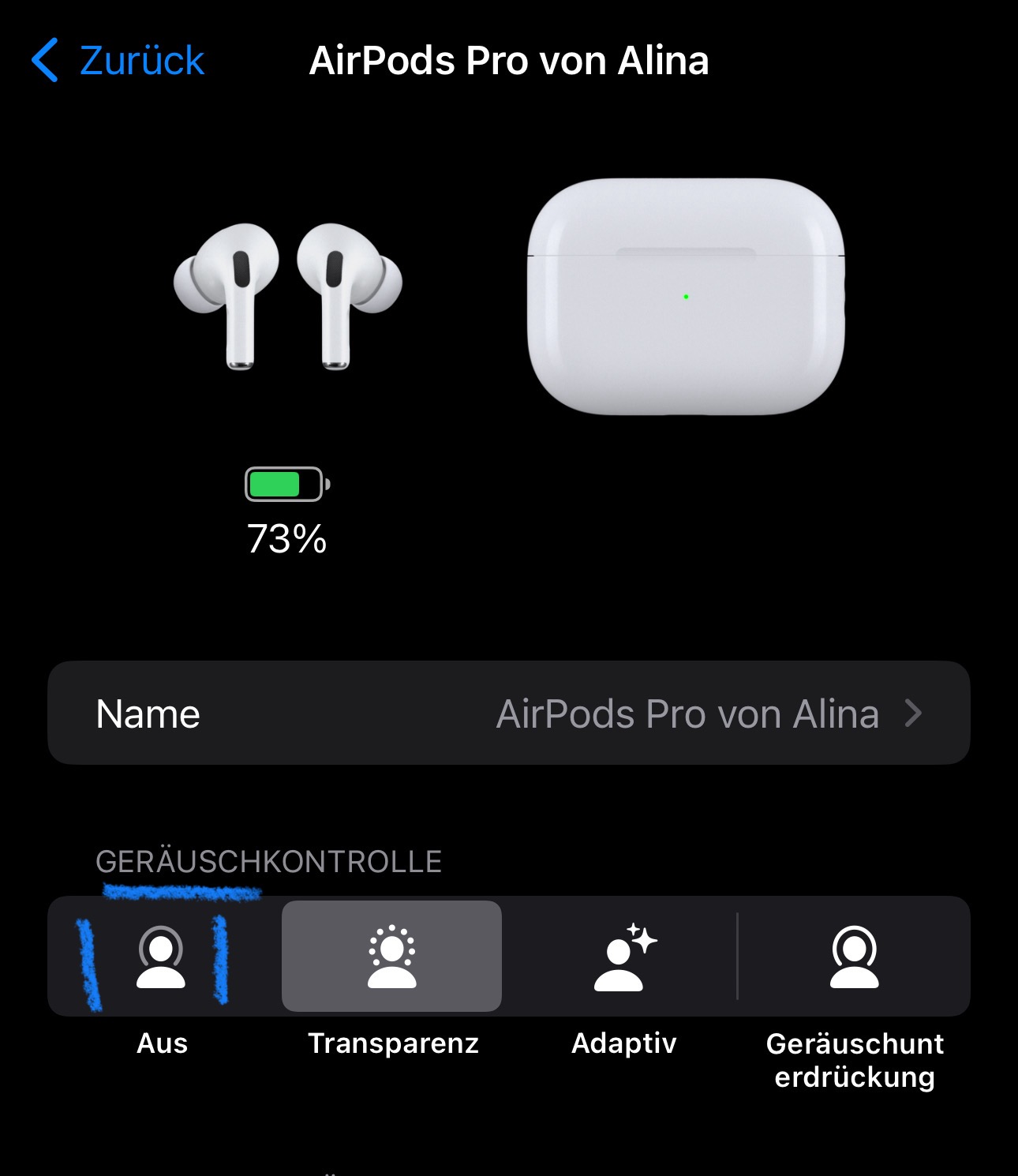 Hallo, ich kann bei meinen AirPods Pro 2 die Geräuschkontrolle nicht mehr ausschalten, wenn ich es versuche switched es einfach auf den ursprünglichen Modus zurück. Ich habe alle vier Modi ausgewählt, daran liegt es also nicht. Das Problem liegt erst seit gestern vor.