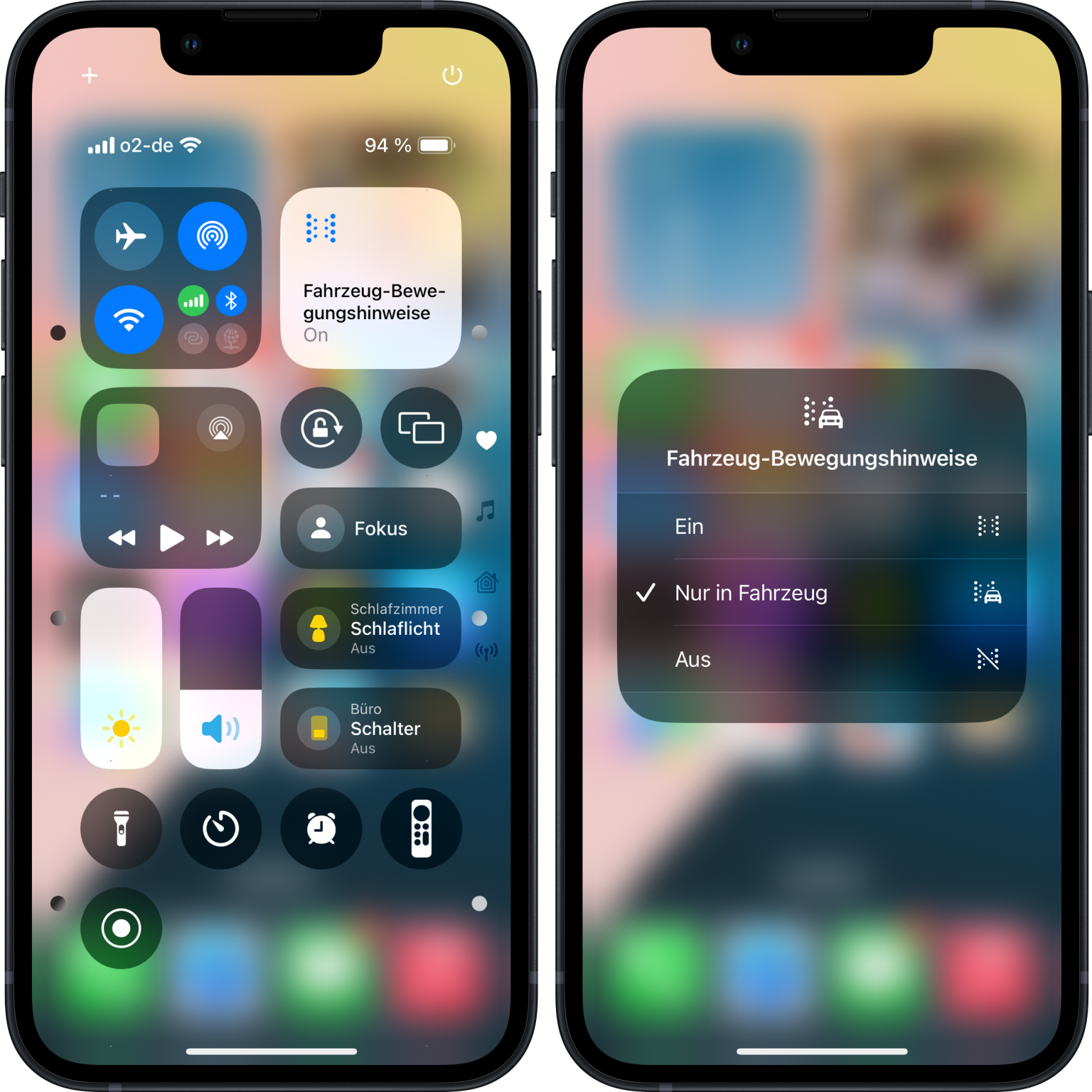 Einstellungen - Bedienungshilfen - Bewegung - Fahrzeugbewegungs-Hinweise anzeigen - Aus