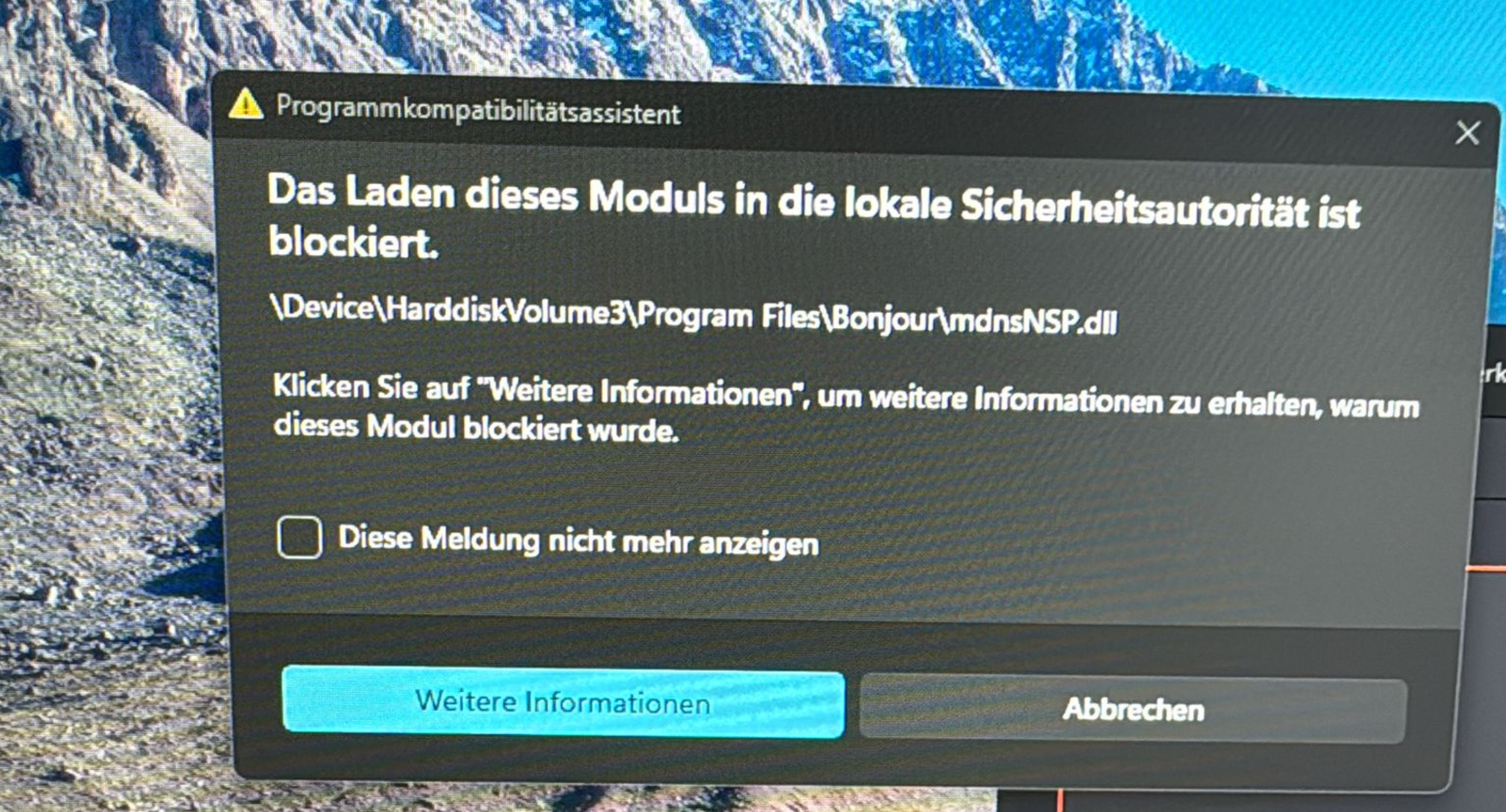 Windows Fehlermeldung wegen iTunes bzw Bonjour - Das Laden dieses Moduls in die lokale Sicherheitsautorität ist blockiert