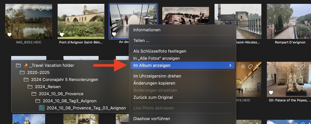 Seit macOS 15.2 können wir direkt sehen, welchen Alben ein Foto hinzugefügt worden ist. Wir brauchen für das Foto nur mit Ctrl-Klick das Kontext-Menü zu öffnen und dann "In Album anzeigen" wählen. Fotos zeigt alle Alben an, in denen das Foto ist. Eine der Neuerungen, für die sich das Upgrade auf Sequoia lohnt.