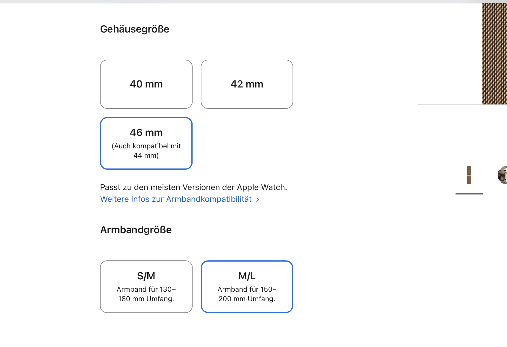 Allerdings finde ich nirgends eine Information dazu, was diese Zahlen zu bedeuten haben, denn cm Angaben können es nicht sein, da das Nachmessen einen anderen Wert ergibt, also ist meine Vermutung, dass es sich um „Zoll“ handelt. Aber auch dazu finde ich nichts. Bei den Größen steht immer nur S/M, M/L und die Größenangabe der Uhr: 42 mm, 45 mm usw. Wahrscheinlich übersehe ich irgendwo etwas.