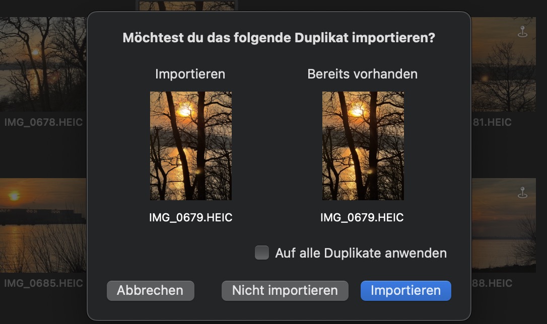 Eines dieser Fotos habe ich als Test aus der App heraus vom Mac exportiert und unter Downloads gespeichert. Anschliessend habe ich exakt dieses Foto (gleicher Name, gleiche Grösse, alles identisch) wieder importiert. Dort hätte ich eben erwartet dass mir die Software sagt, dieses Foto existiert bereits in der Mediathek. Macht er aber eben nicht. Er importiert mir also exakt das gleiche Foto erneut und listet mir somit anschliessend 2 identische Fotos in der Mediathek auf. ...