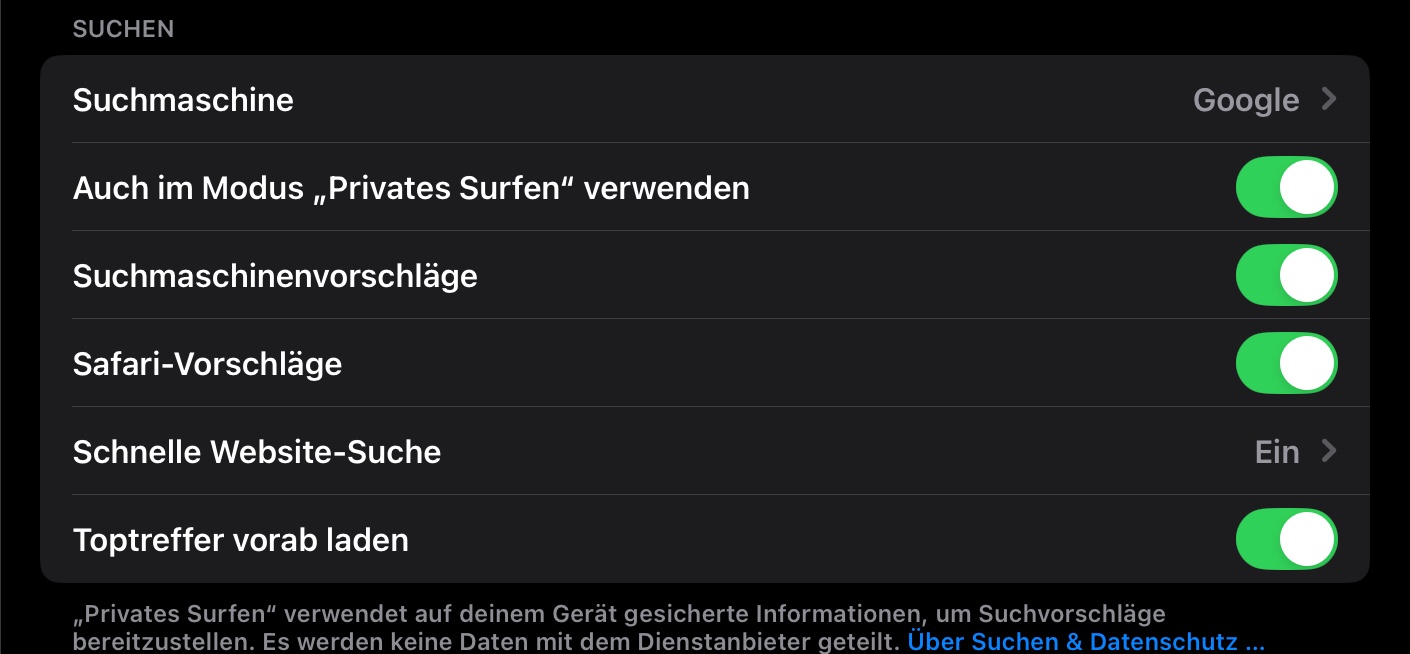 Hallo ich brauche mal eure Hilfe, bei mir werden die Safari-Vorschläge nicht angezeigt. Ich habe schon alles einstellen aktiviert. Hier mal ein Bild.
