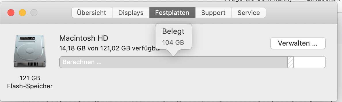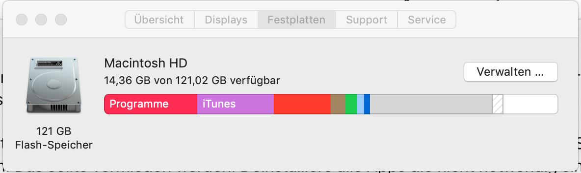 Bitte poste einen Screenshot deiner Festplattenbelegung: Apfel-->Über diesen Mac-->Festplatten.